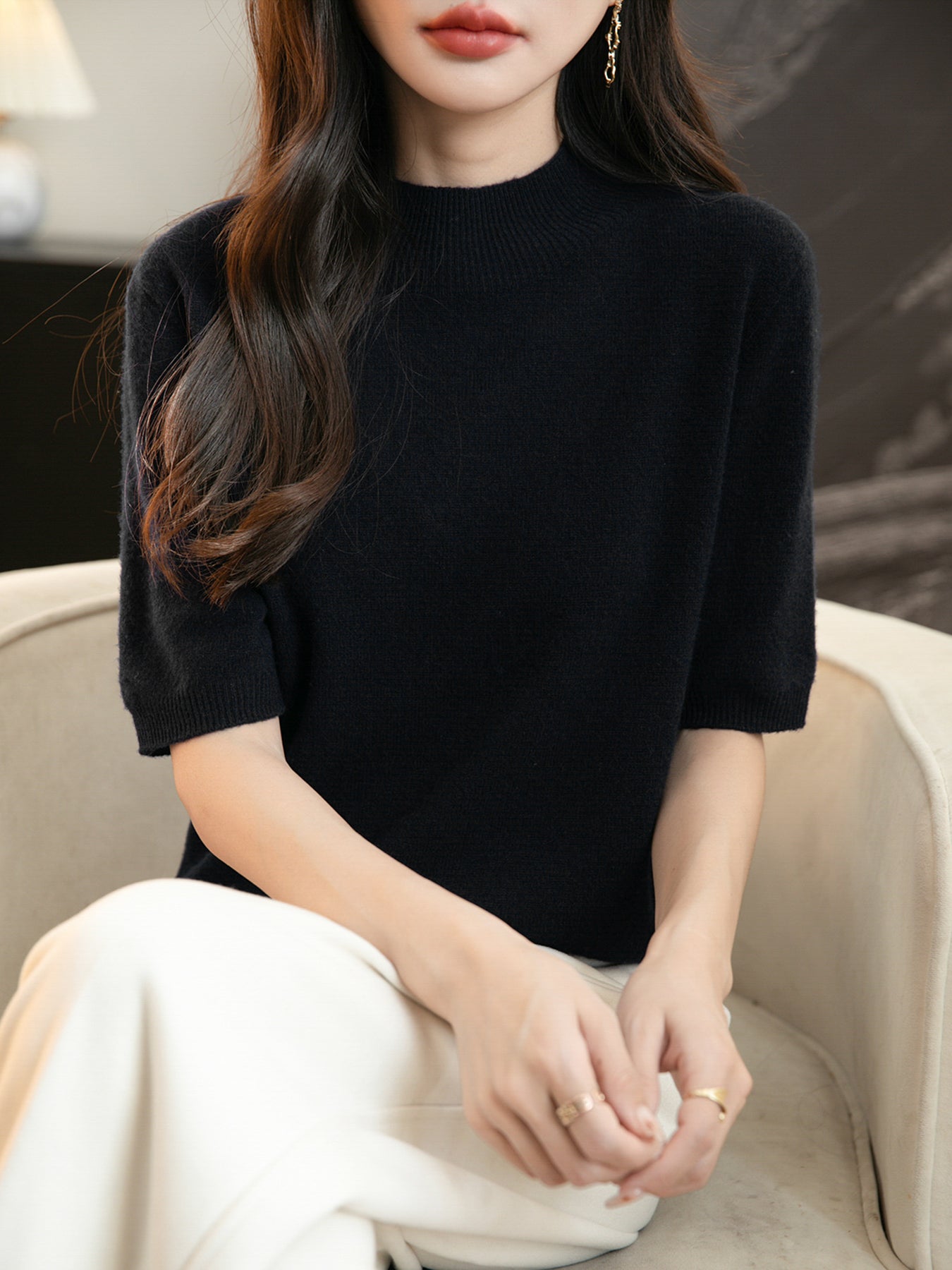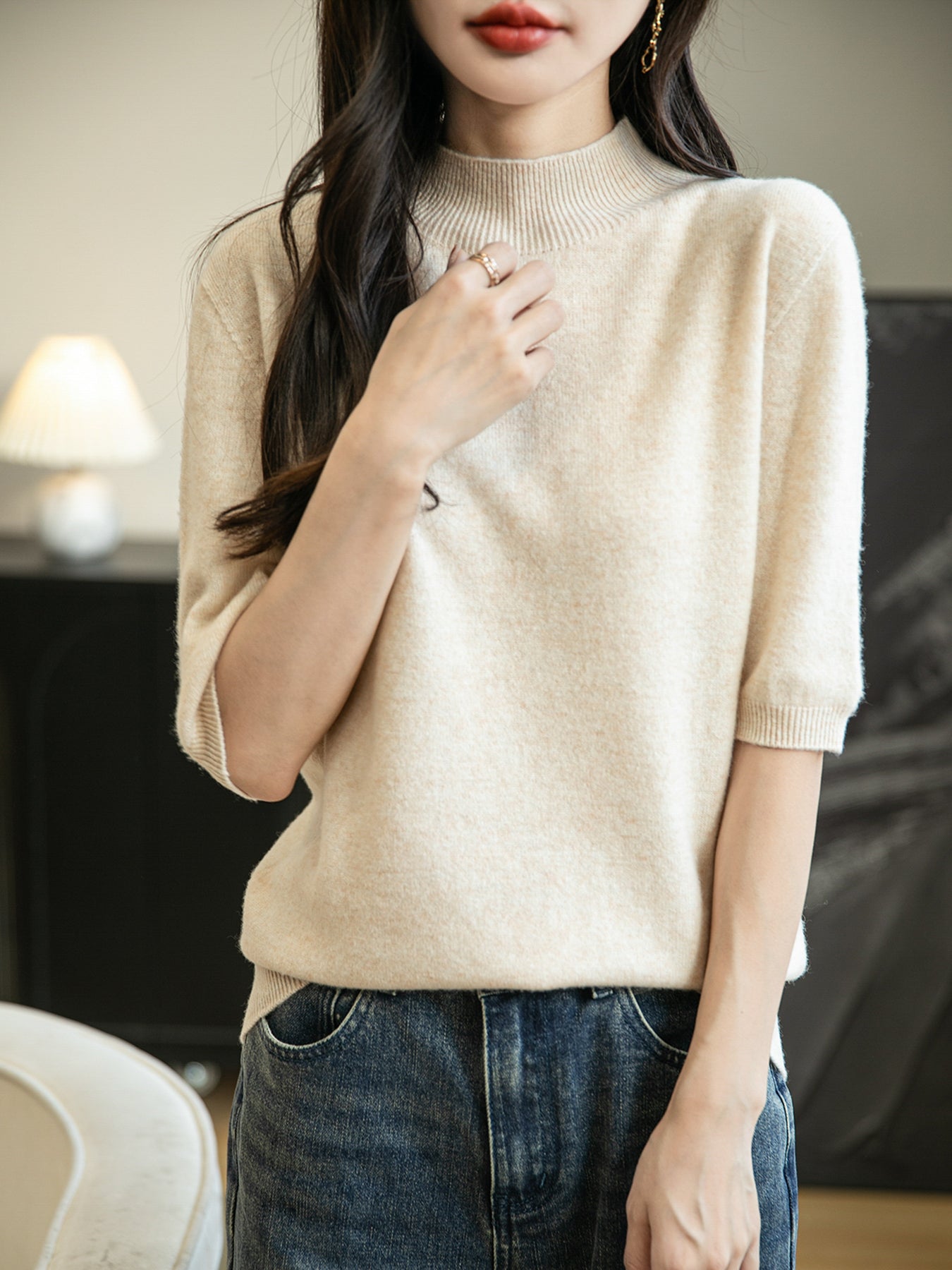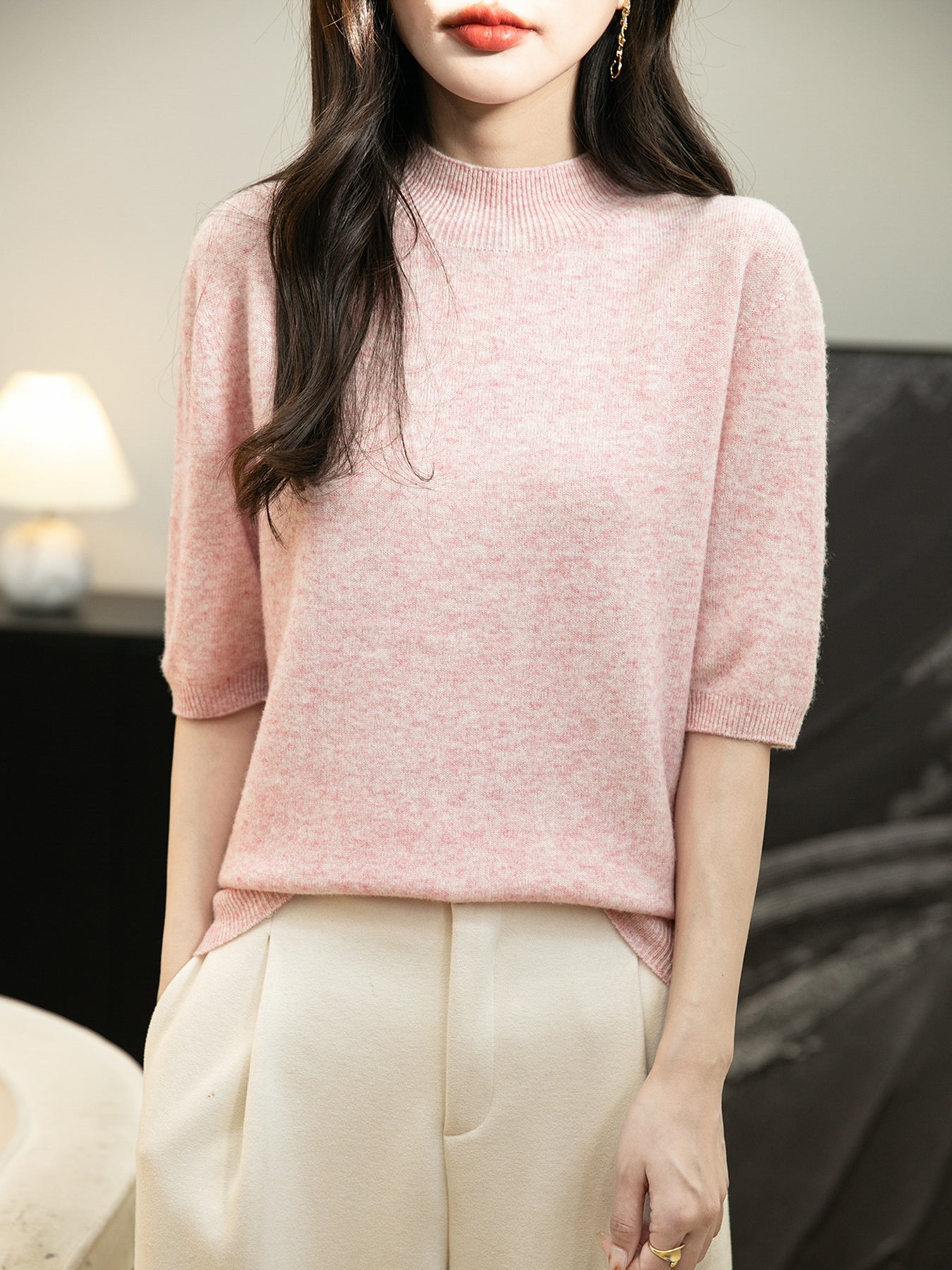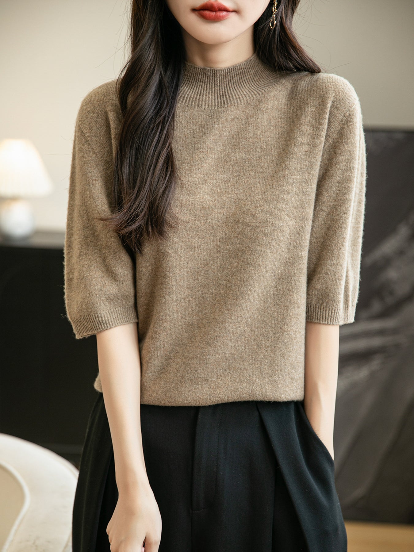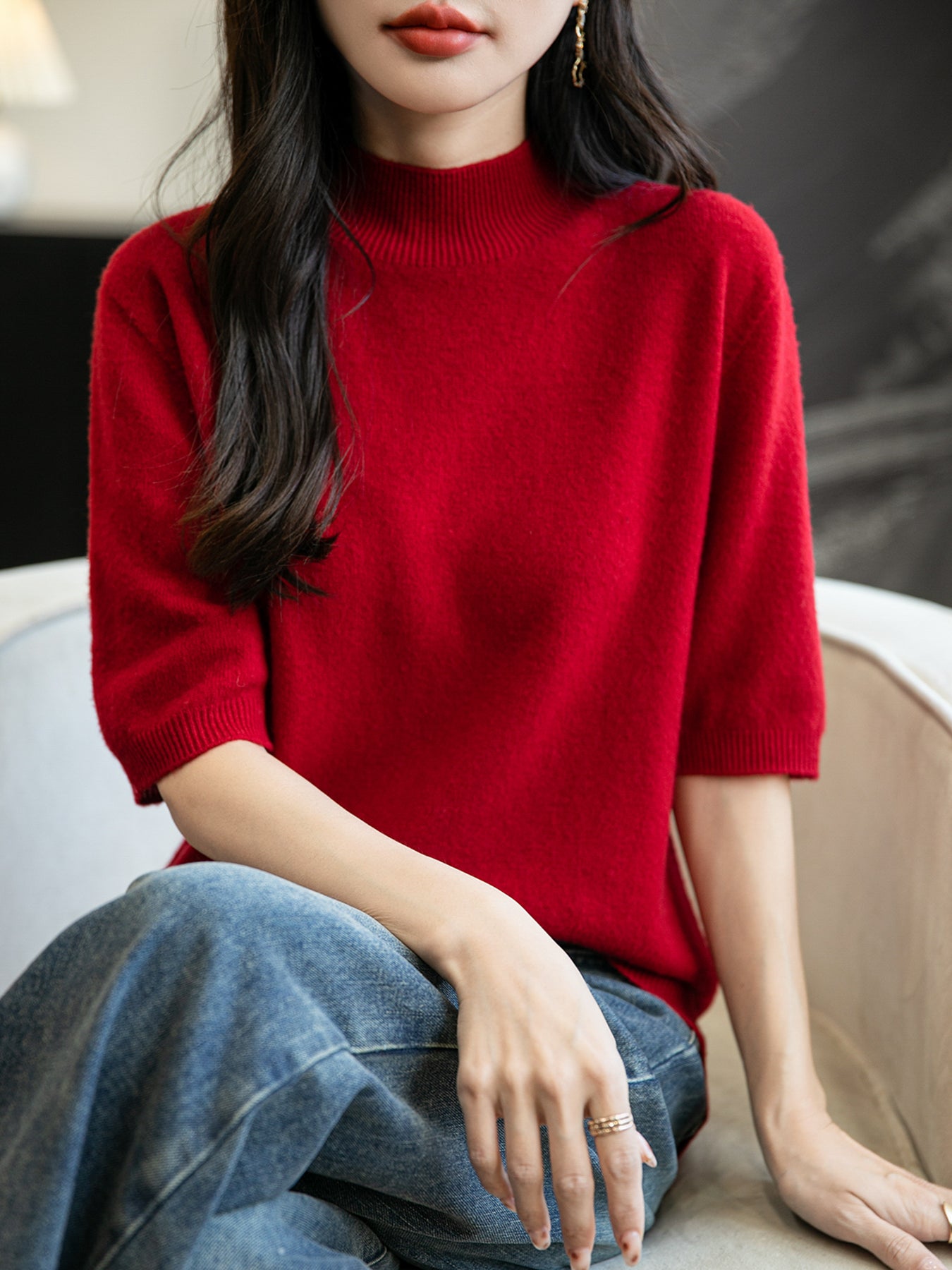 100% 메리노 울 반소매 모크넥 심리스 스웨터