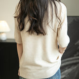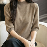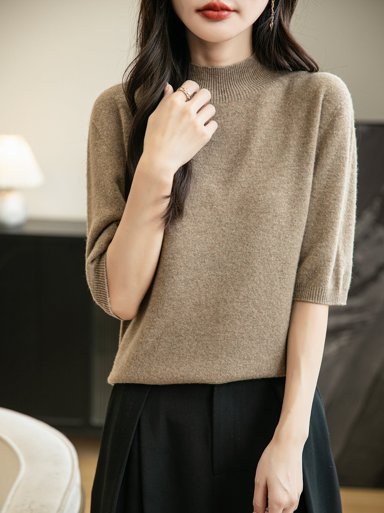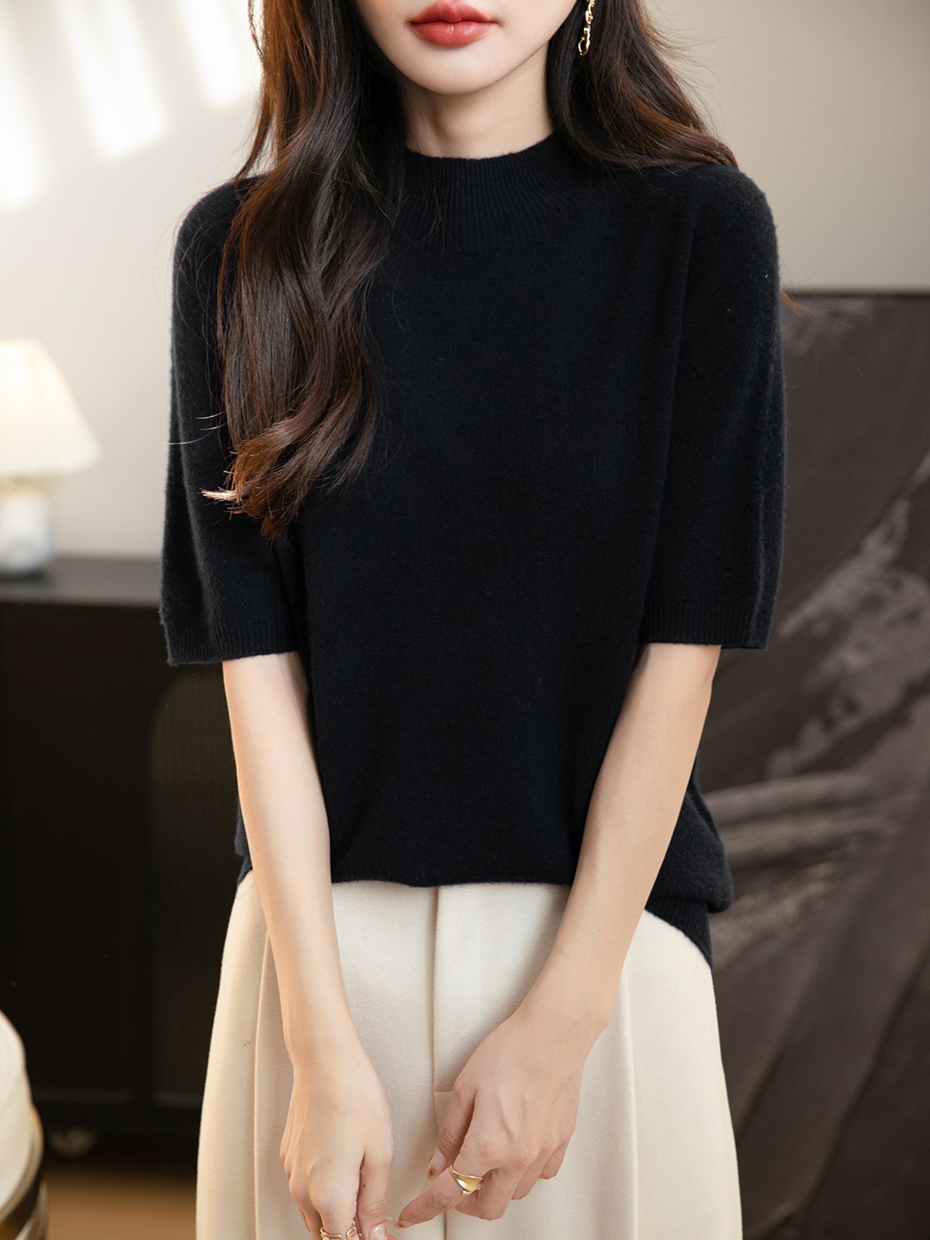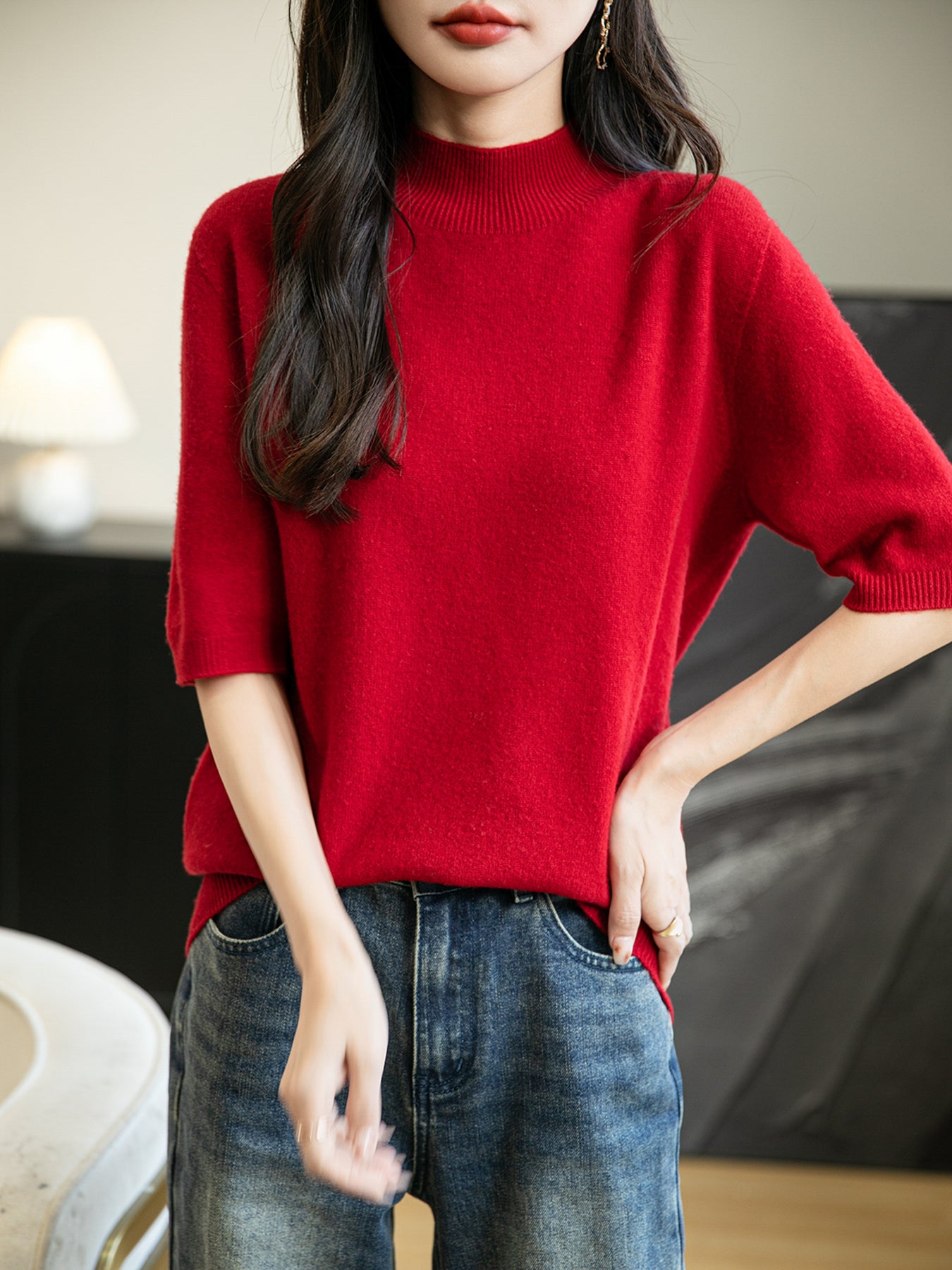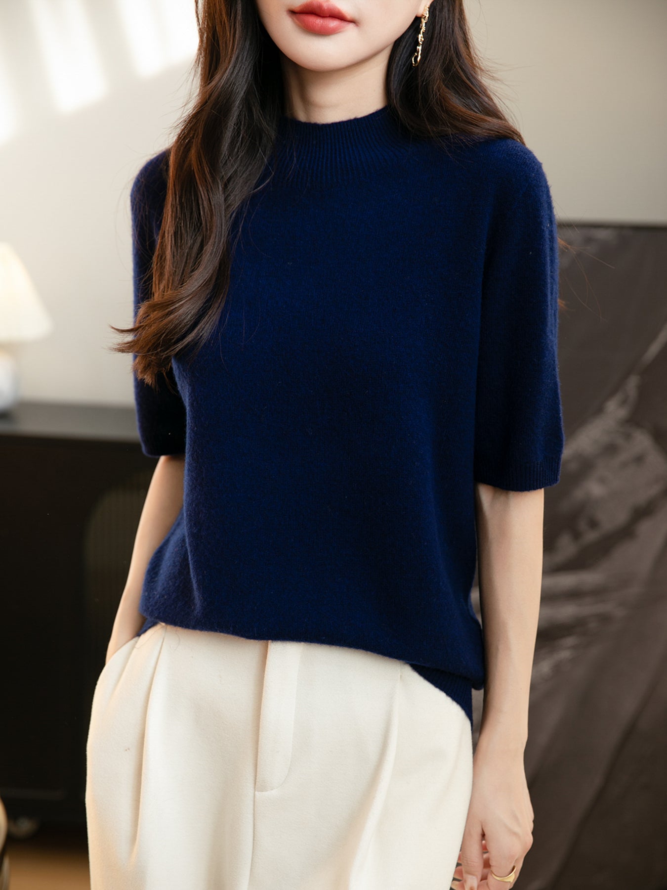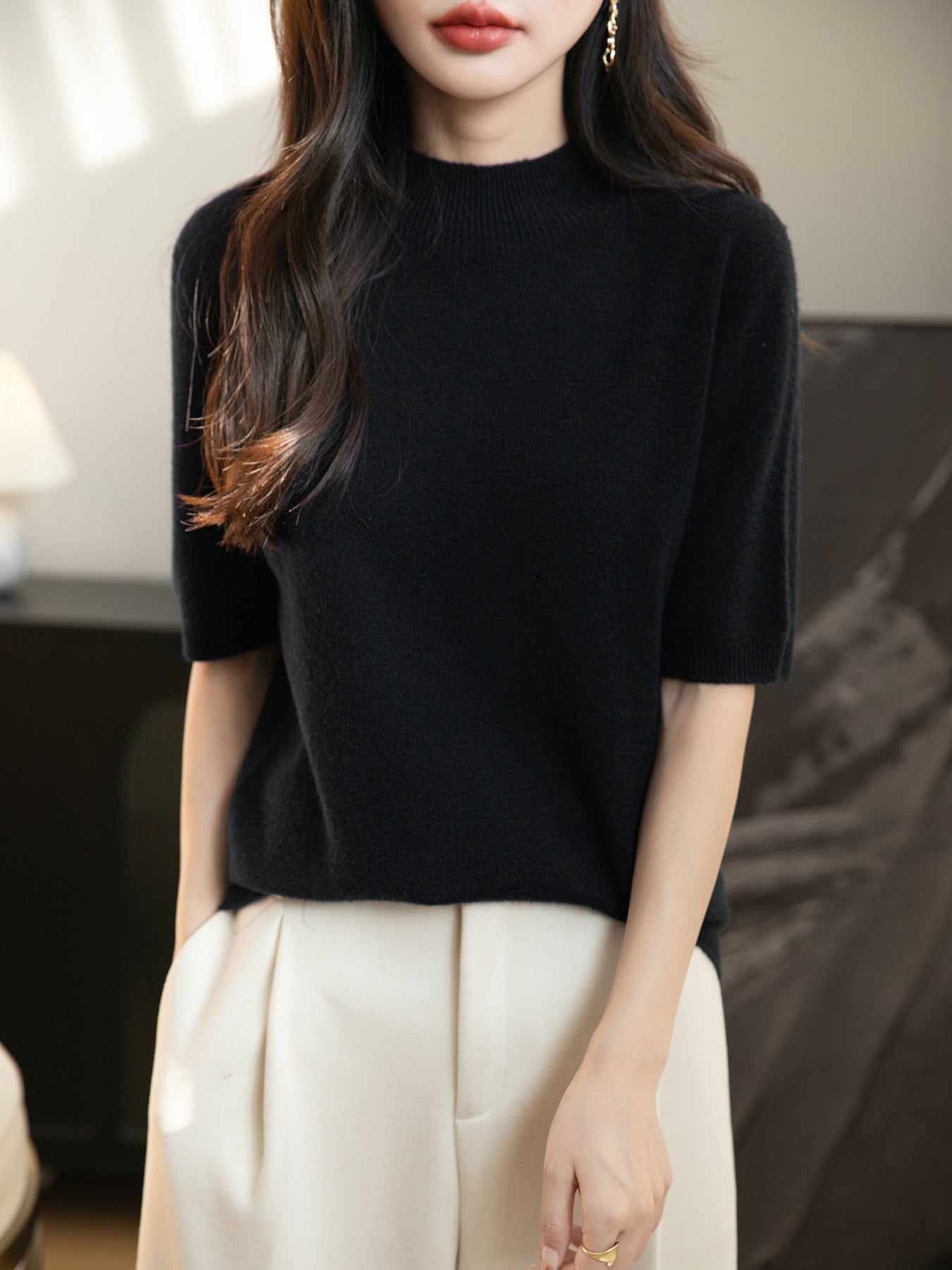 100% 메리노 울 반소매 모크넥 심리스 스웨터