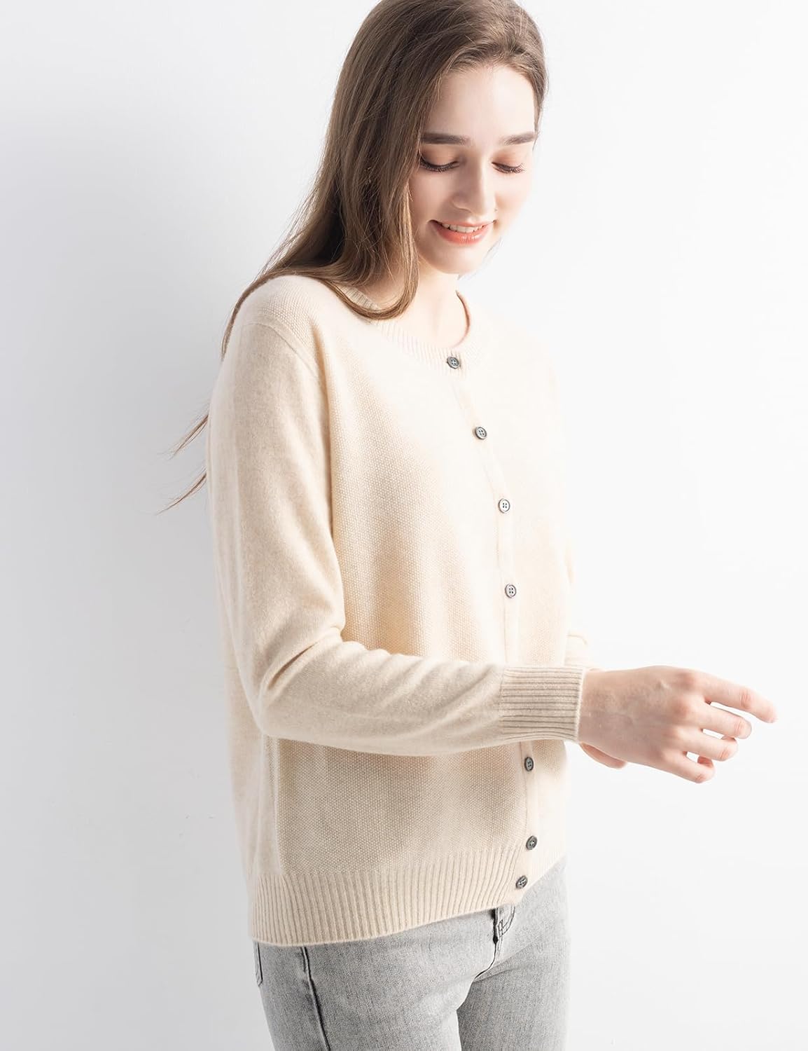 i love a good cashmere sweater and this cardigan is equally fab. Very soft and smooth without itchiness. TTS with a regular cut. You could size down for a more fitted look if you like. The buttons are nice and doesn’t look cheap. Although it’s a bit of a pain ironing it after washing because they dont line up well. I do love how it’s lightweight yet warm and cozy. Color is beautiful and looks great on all skin tones. This is a very well made sweater especially for the price. It’s a bargain compared to other brands and equally good quality. Make to wash in Landry bad on delicate and air dry.