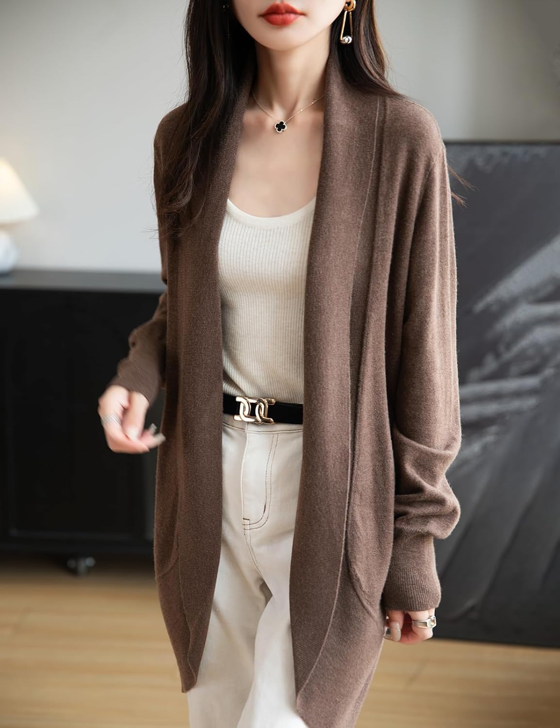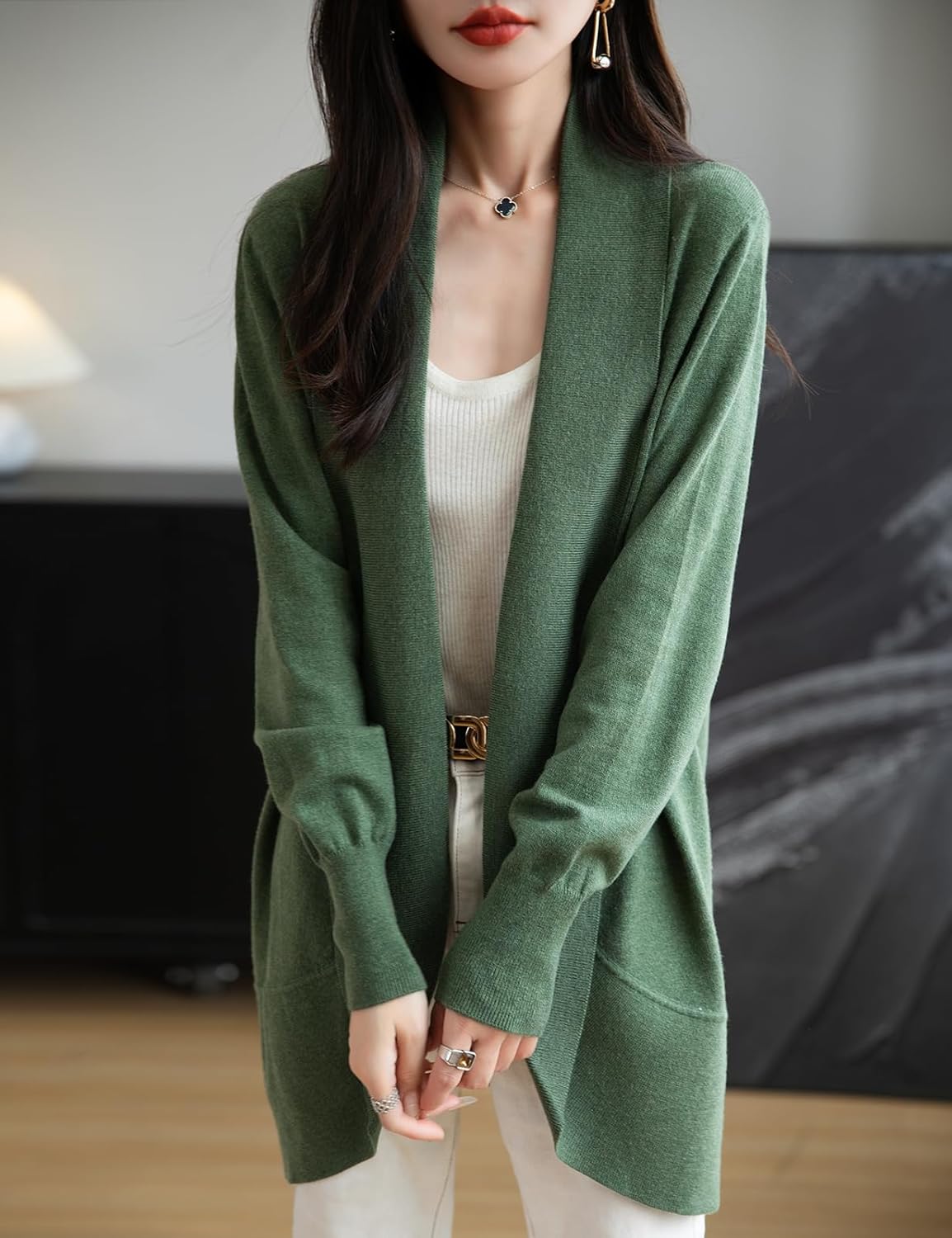 I absolutely love this cardigan! The merino wool blend feels soft and cozy without being bulky, and it drapes beautifully. It’s warm enough for fall and perfect for layering through winter. The open front gives it a relaxed, easy look that works with jeans or leggings. It feels high quality and comfortable enough to wear all day. Definitely one of my favorite new pieces for the season.