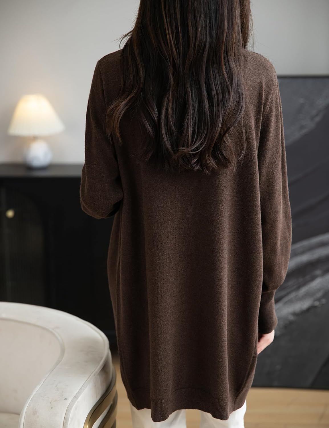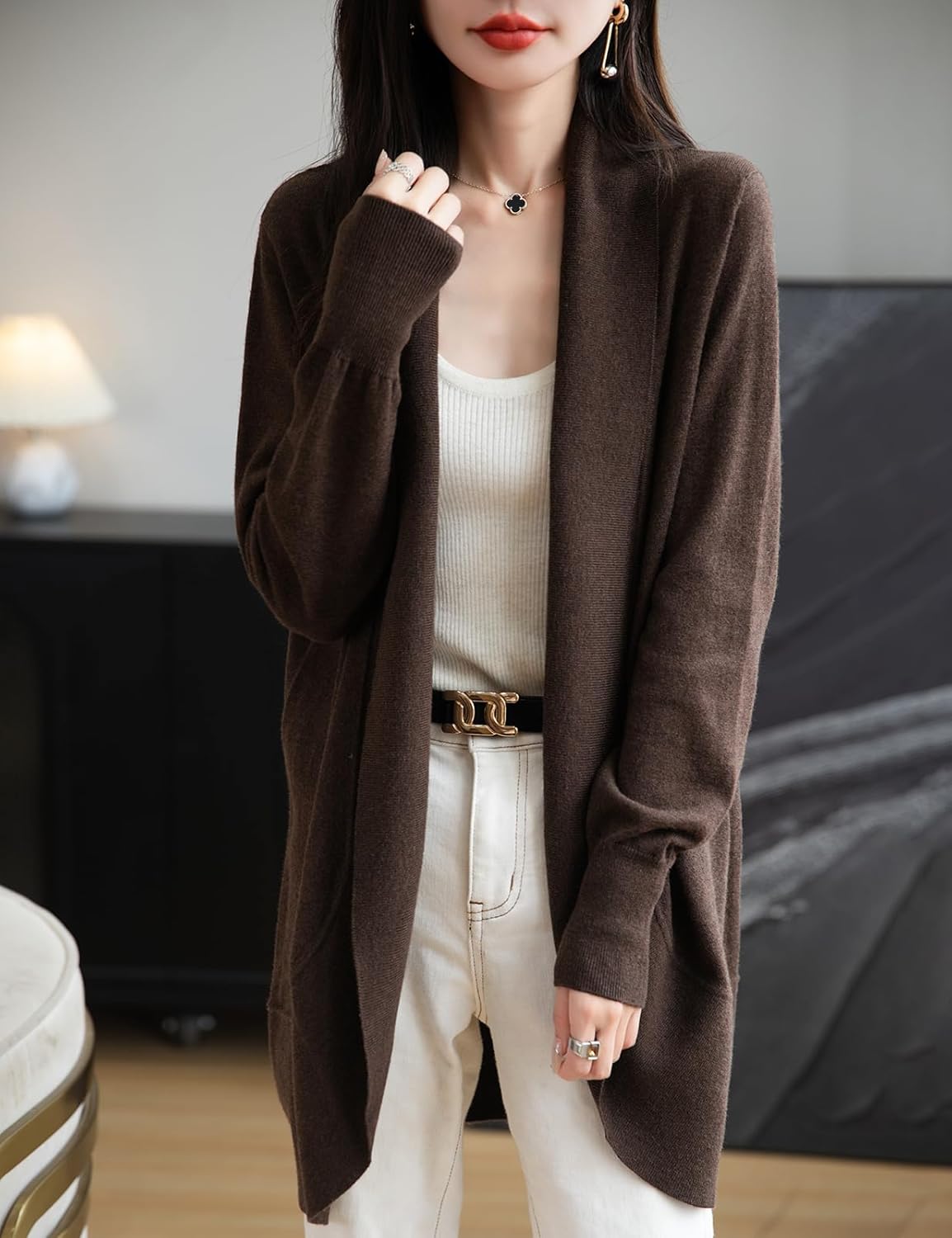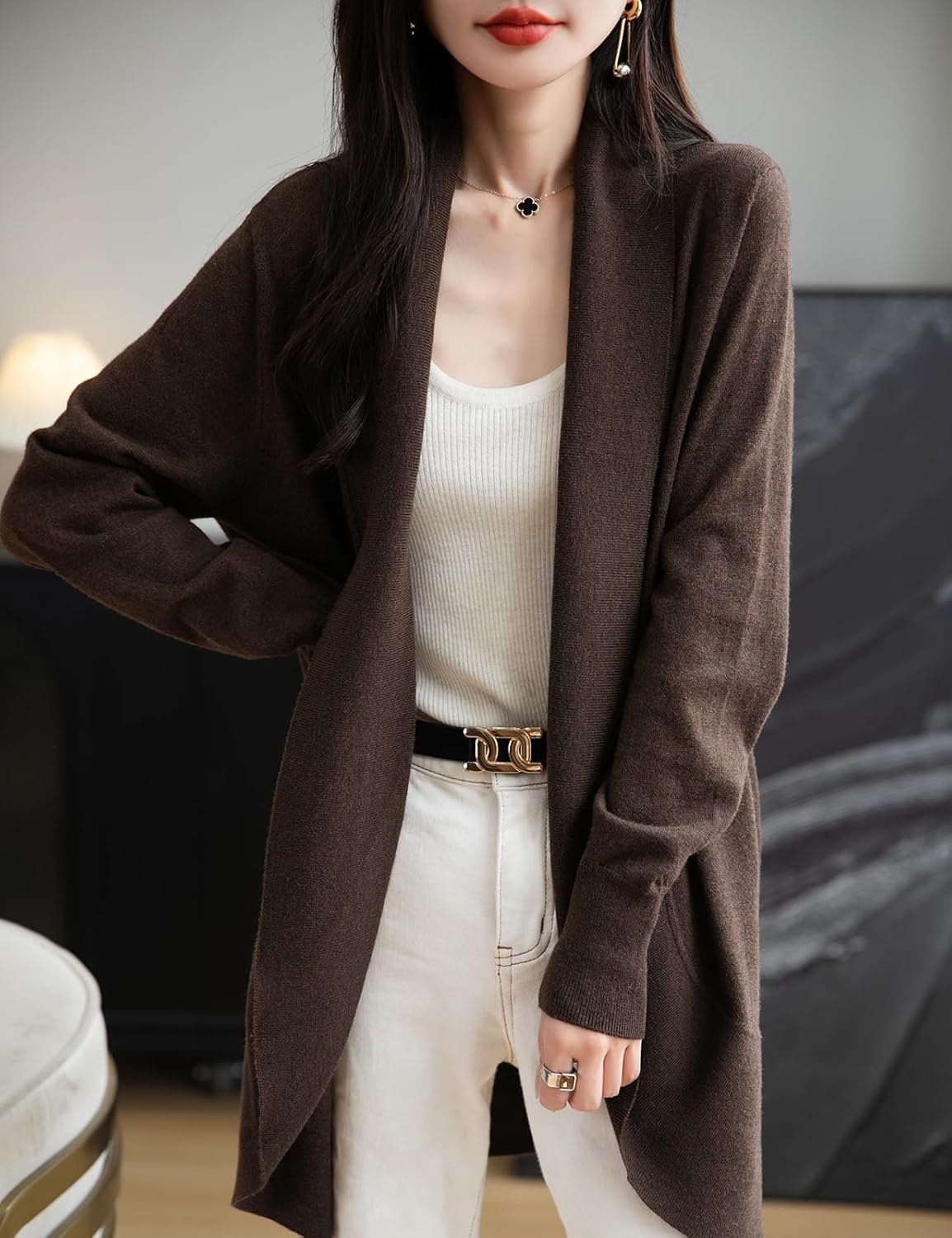 I’m always on the lookout for sweaters that work well in an office setting, and this cardigan is just perfect. It’s warm, soft, and has just enough structure to look polished without feeling bulky or frumpy. The open front drapes beautifully, creating a subtle lapel effect that gives it a more tailored look.I chose the brown for a change from my usual black, and I’m so glad I did, the rich chocolate tone still feels neutral but adds a touch of sophistication. It’s a simple piece with an upgraded feel that easily transitions from work to casual wear.
