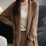 This tan-camel shawl-collared sweater is such a beautifully made and versatile piece. The color is that perfect warm neutral that goes with absolutely everything — from jeans and boots to skirts or dress pants. It hits just below the waist, which gives it a flattering, slightly elongated look without being too long or bulky. The open-front design drapes effortlessly, creating that casual-chic vibe that looks like you tried without really trying.The material is what truly sets it apart. It’s made from a soft, supple fiber blend that feels luxurious to the touch — smooth, cozy, and not at all scratchy. It’s lightweight yet warm, making it ideal for layering over tees or blouses as the weather cools down. The shawl collar lays beautifully and adds a bit of structure while keeping that relaxed feel. Every seam feels well-constructed, and it hangs nicely without losing its shape after a few wears. It's going to pair so perfectly with scarves and under a big winter coat... and the color... so rich and perfect for fall and the upcoming winter months.Overall, this sweater is an easy 5-star favorite. It’s elegant, cozy, and endlessly wearable — the kind of staple you’ll reach for over and over again throughout fall and winter. I love that it looks polished enough for work but comfortable enough for lounging at home. A total win in both quality and style! I also love this brand because they use 40% anti-pilling fibers so you know this sweater is always going to stay looking great!