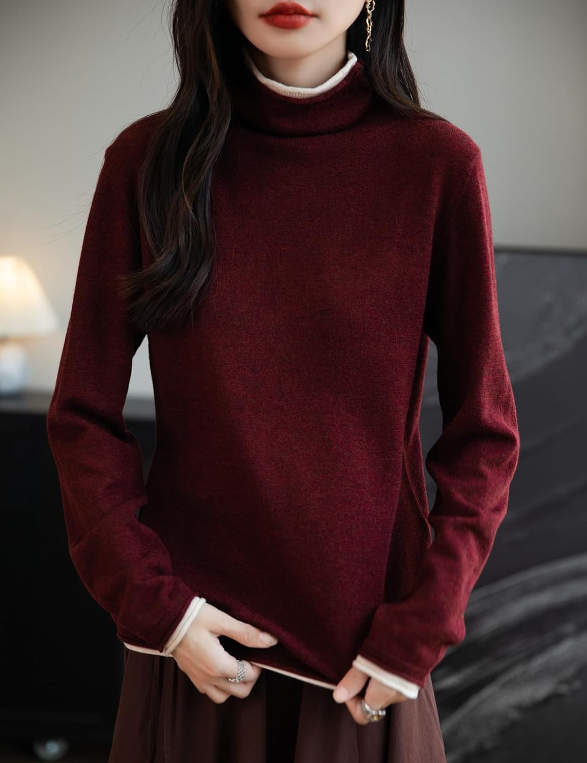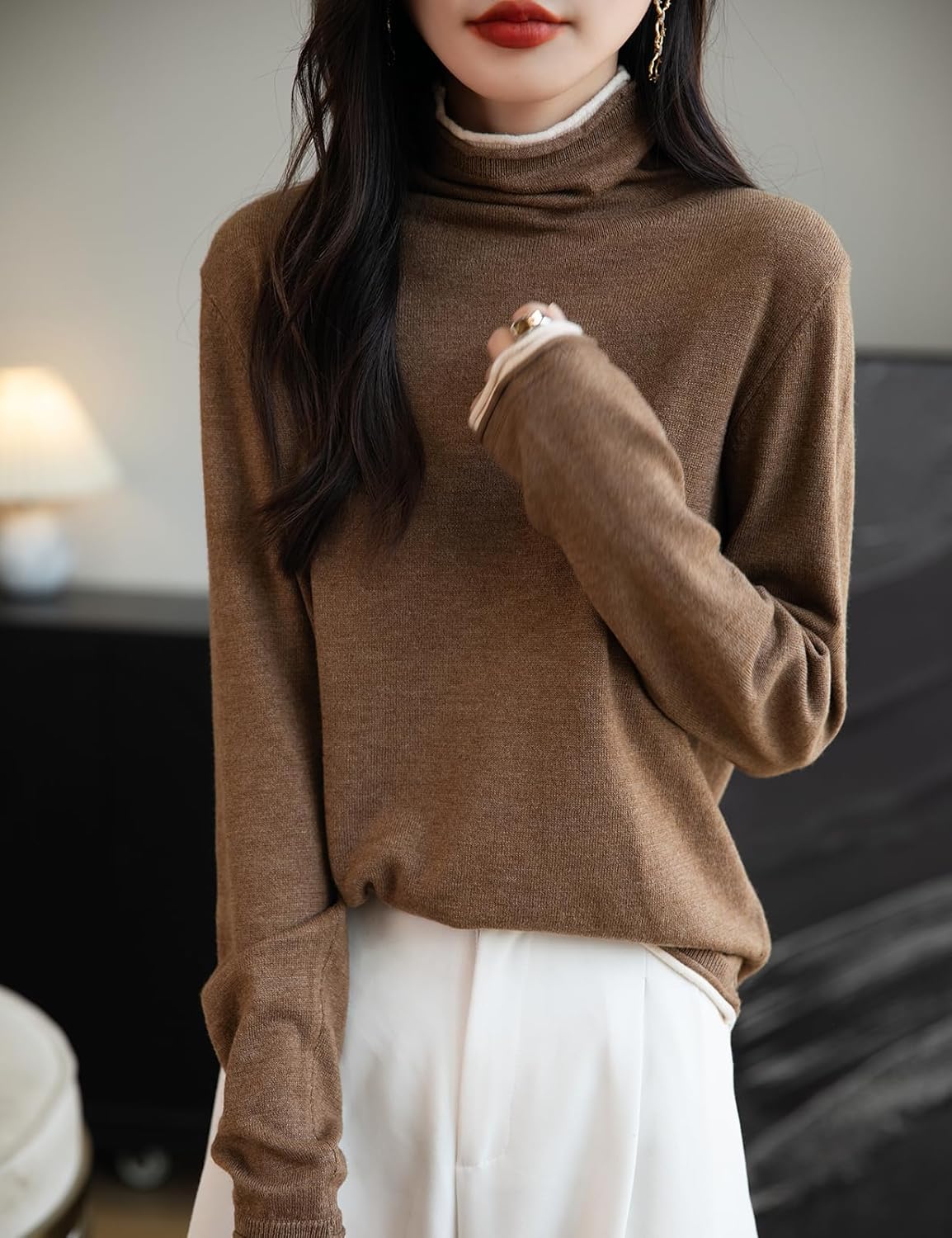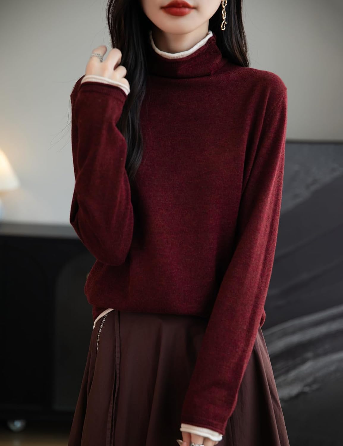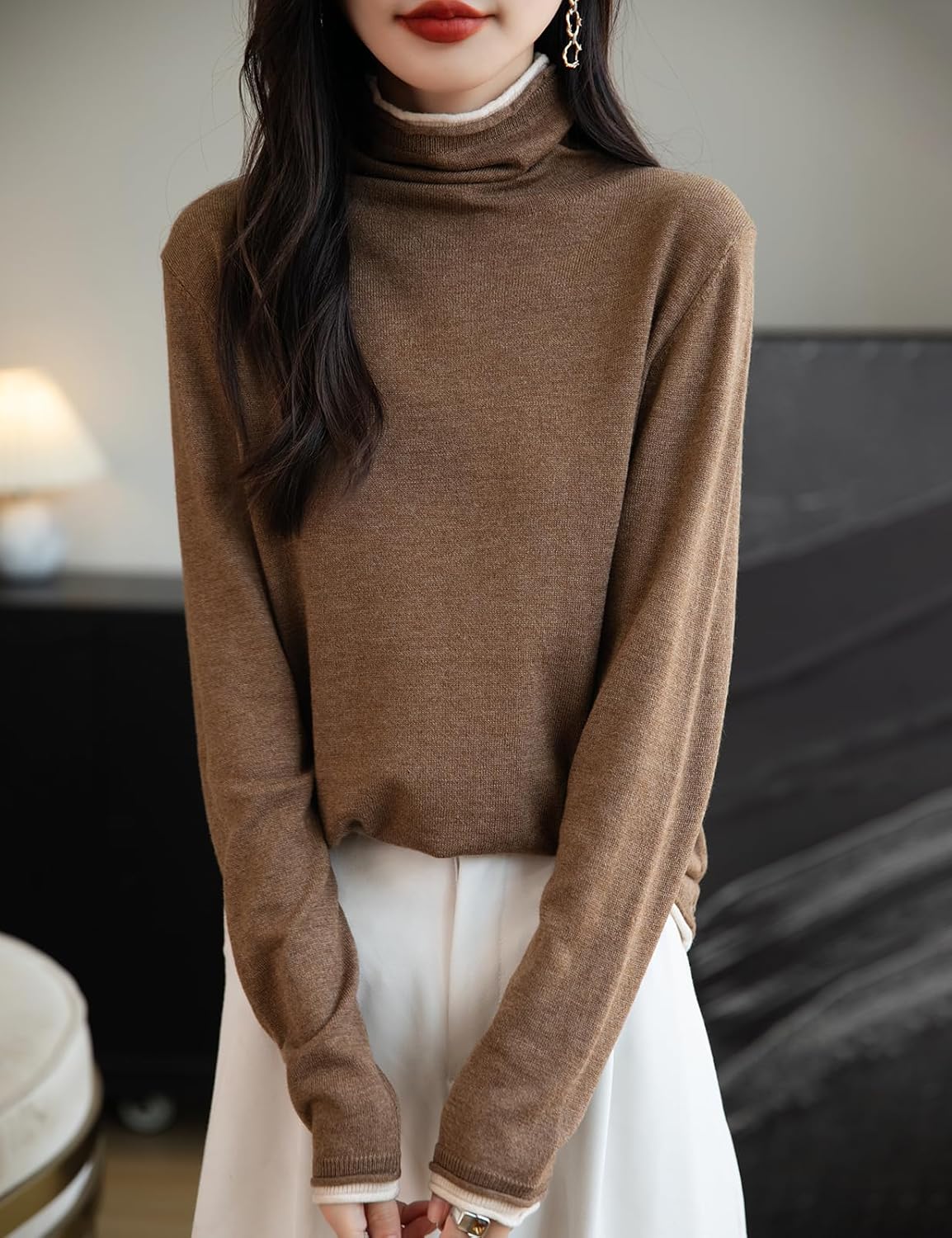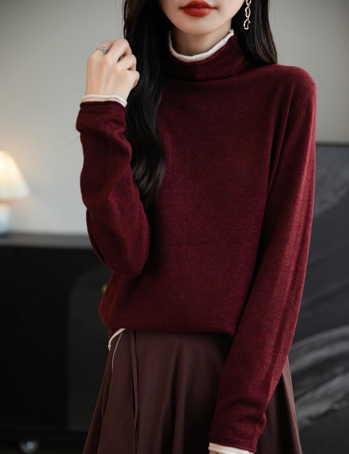 This merino wool blend sweater is very soft and lightweight while still providing a lot of warmth. I like the double fabric look without having the bulk of two actual layers. The only reason I took off one star is because the turtleneck cannot be folded down without showing seams (see 2nd picture). The turtleneck is rather tall, so when I pushed it down lower, it felt a bit constricting around my neck.