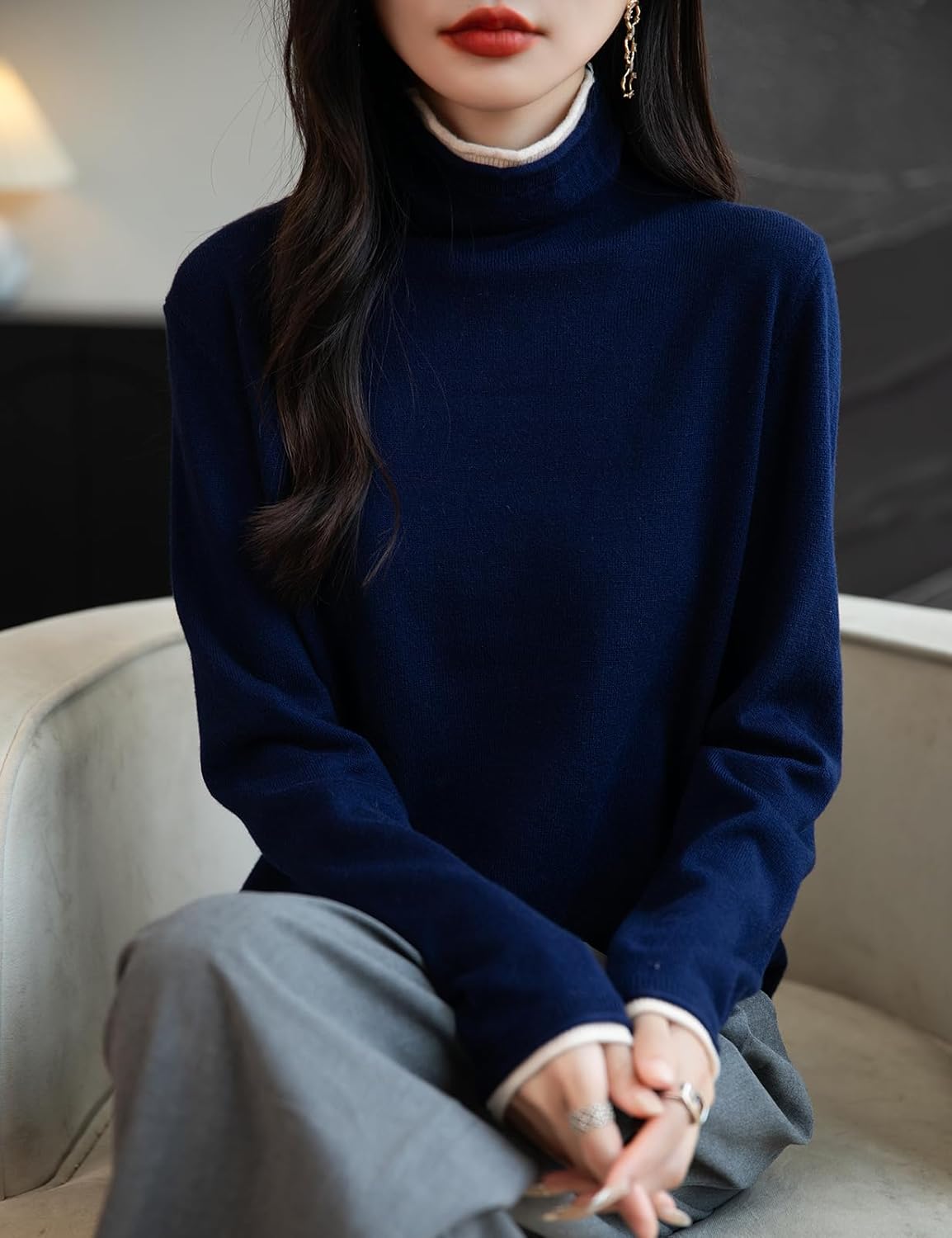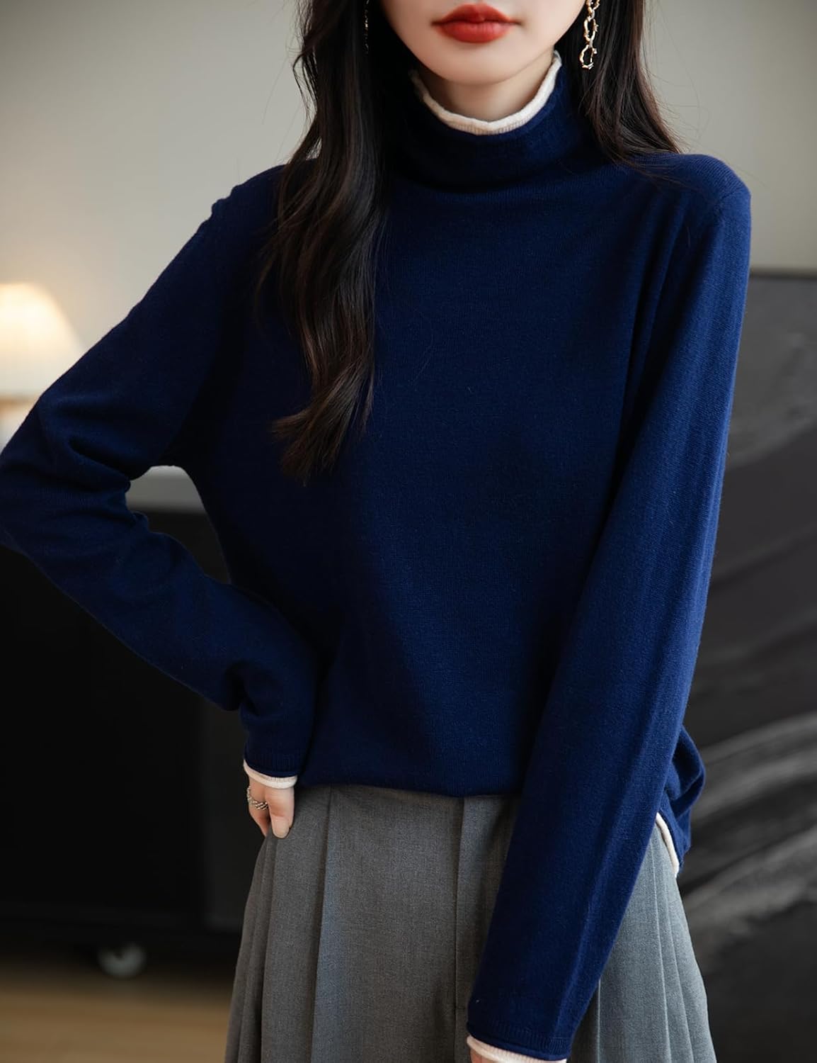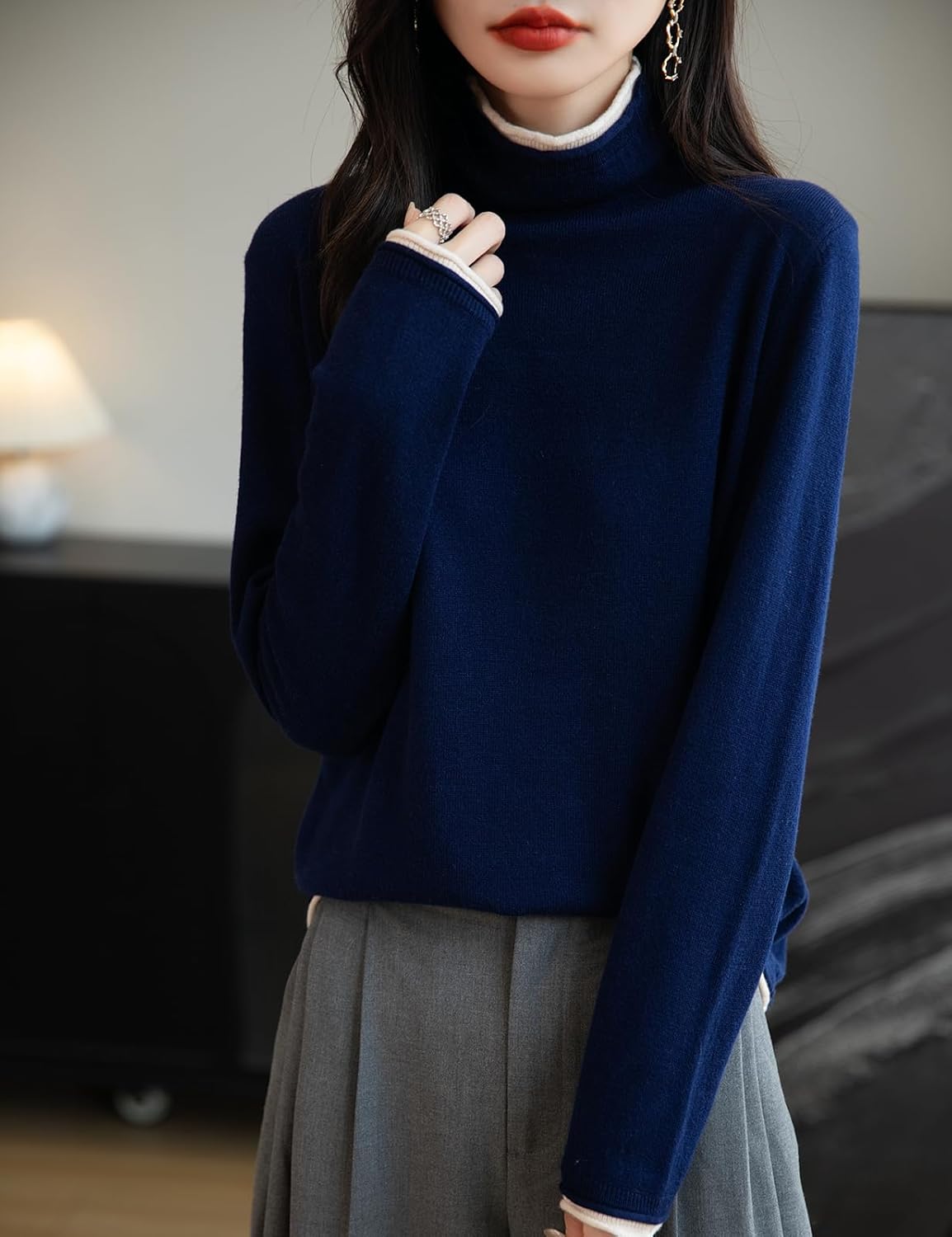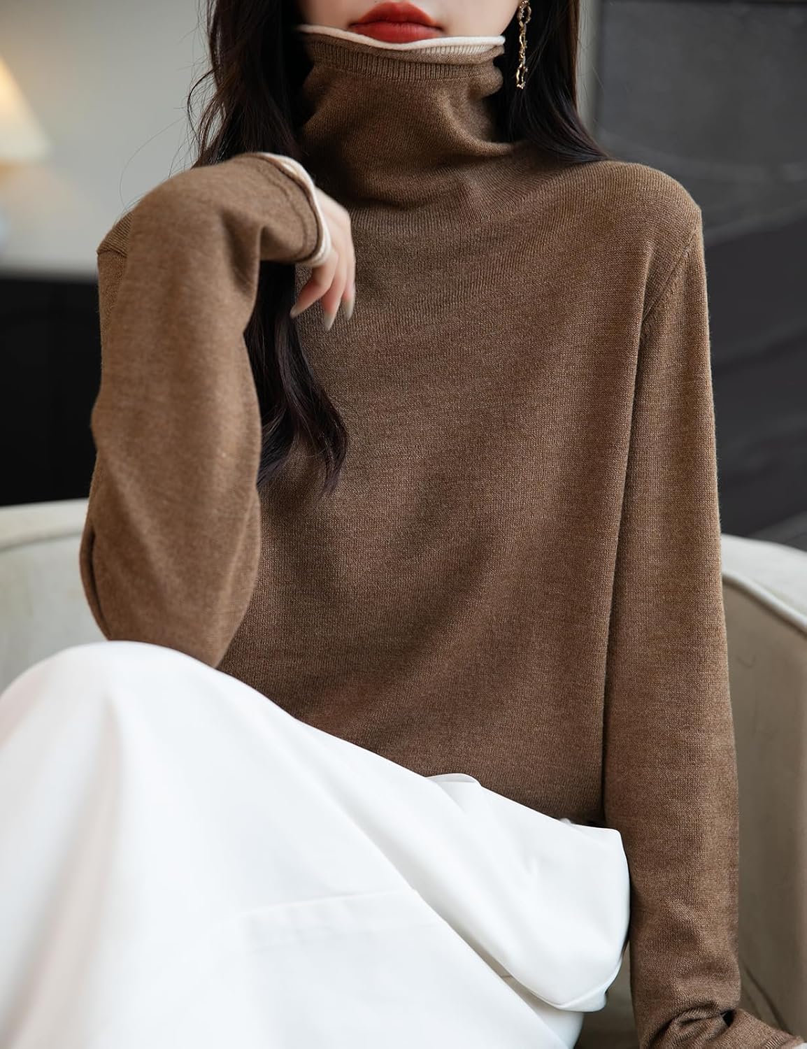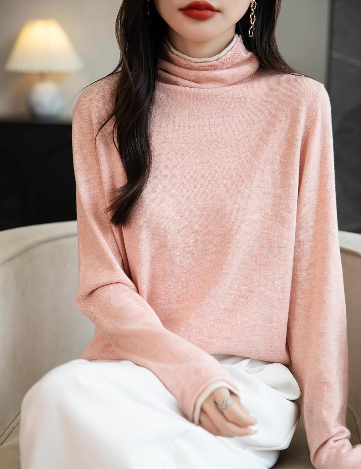 This merino wool blend sweater is very soft and lightweight while still providing a lot of warmth. I like the double fabric look without having the bulk of two actual layers. The only reason I took off one star is because the turtleneck cannot be folded down without showing seams (see 2nd picture). The turtleneck is rather tall, so when I pushed it down lower, it felt a bit constricting around my neck.