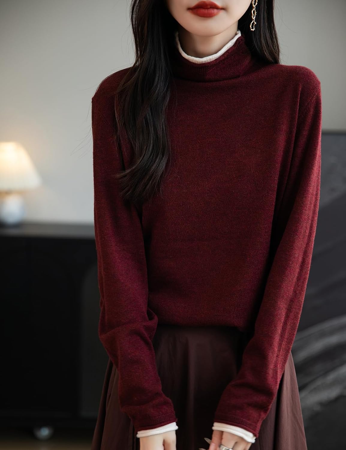 The Ciovkis turtleneck sweater is quite nice. It’s a fake 2 piece with neckline and sleeves appearing to peek out as an ivory base layer. The sweater has a boxy shape that falls to my hip bone. The sleeves could be a bit longer; I don’t have especially long arms and the sleeve ends just before my wrist. I’m not a fan of turtlenecks, as I always feel like I’m being strangled but I was able to turn down the neck into a mock turtleneck and it was comfortable. The fabric isn’t especially thick and not too warm to be worn inside. I ordered the burgundy in a size small. The shade is deep and elegant, and the small fit my 5’4” 110 frame perfectly. This will look great with slim black pants and boots for fall and winter.