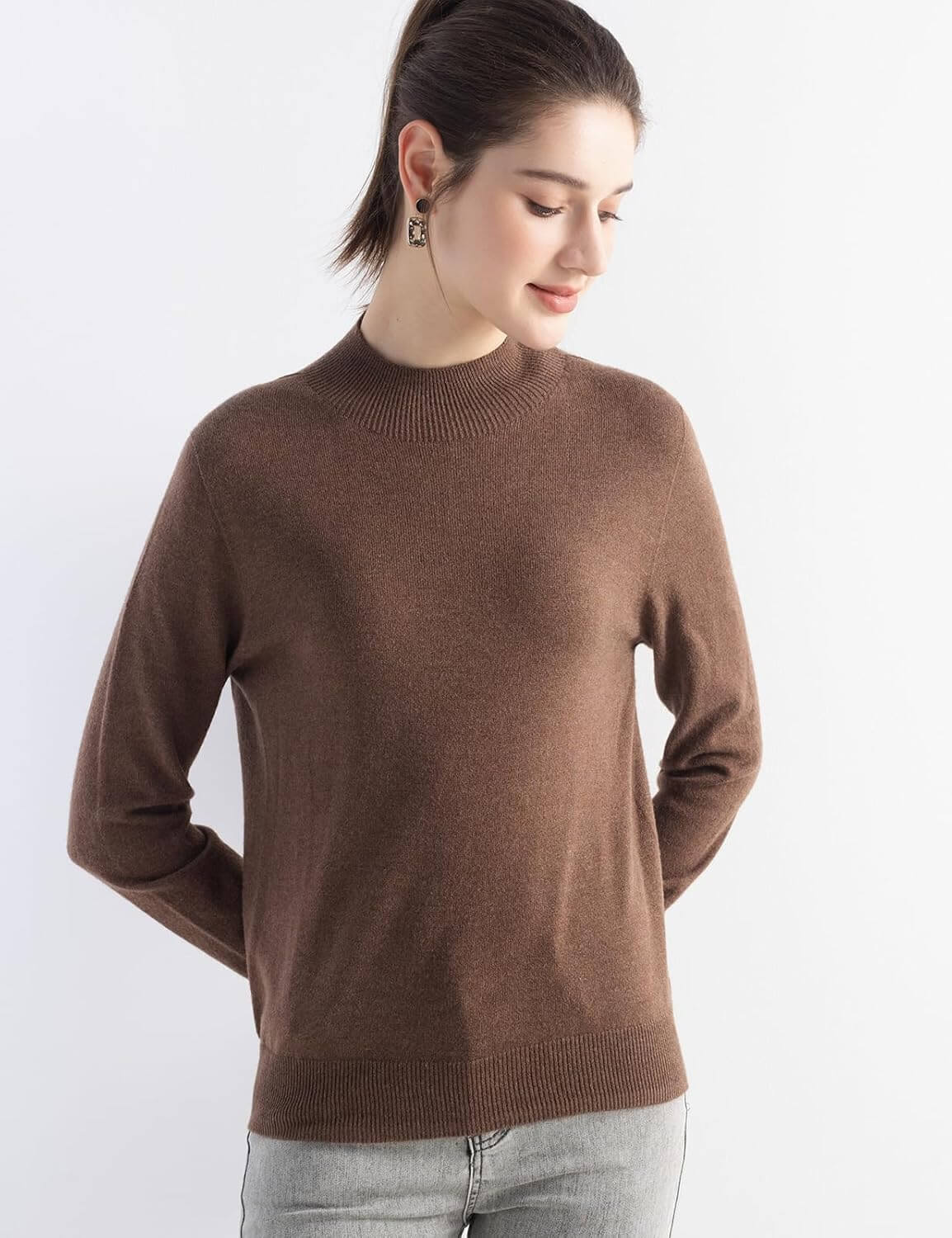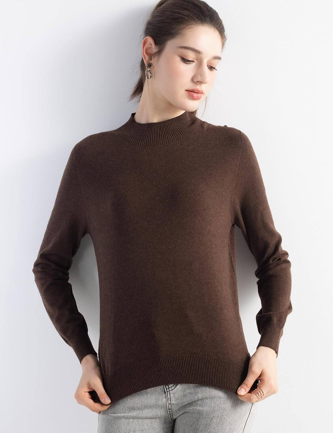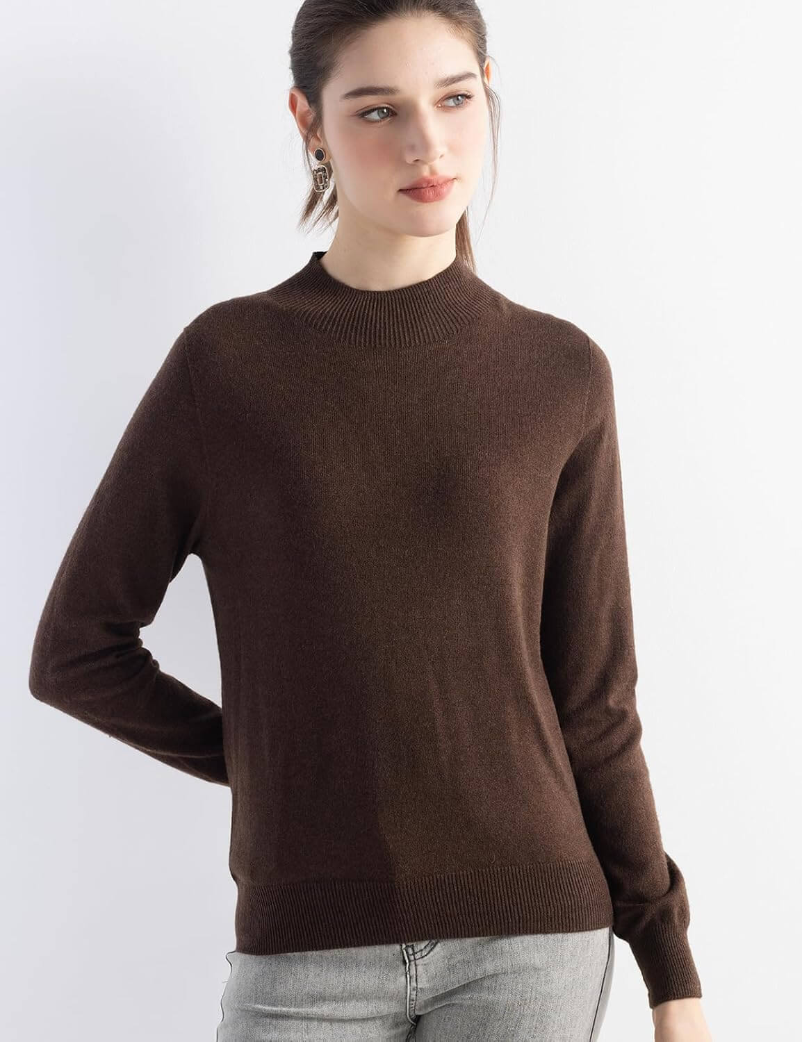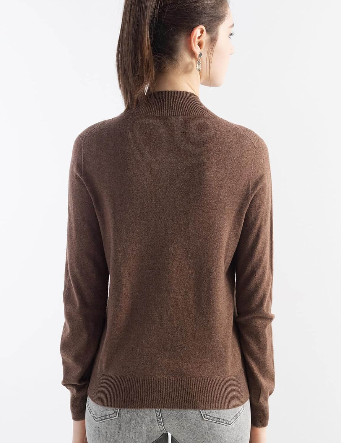 This sweater is perfect for fall. I plan on wearing it for the winter also but the espresso brown color is perfect for any autumn outfit. The fabric is not as soft as I would like but it is not itchy enough that I can't wear it. It fits very true to size, and the sleeves are a great length for us ladies with long arms. Very nice quality. I like that the mock neck does not come up too high to be annoying, it is a perfect cut. Overall great addition to your fall/winter wardrobe.