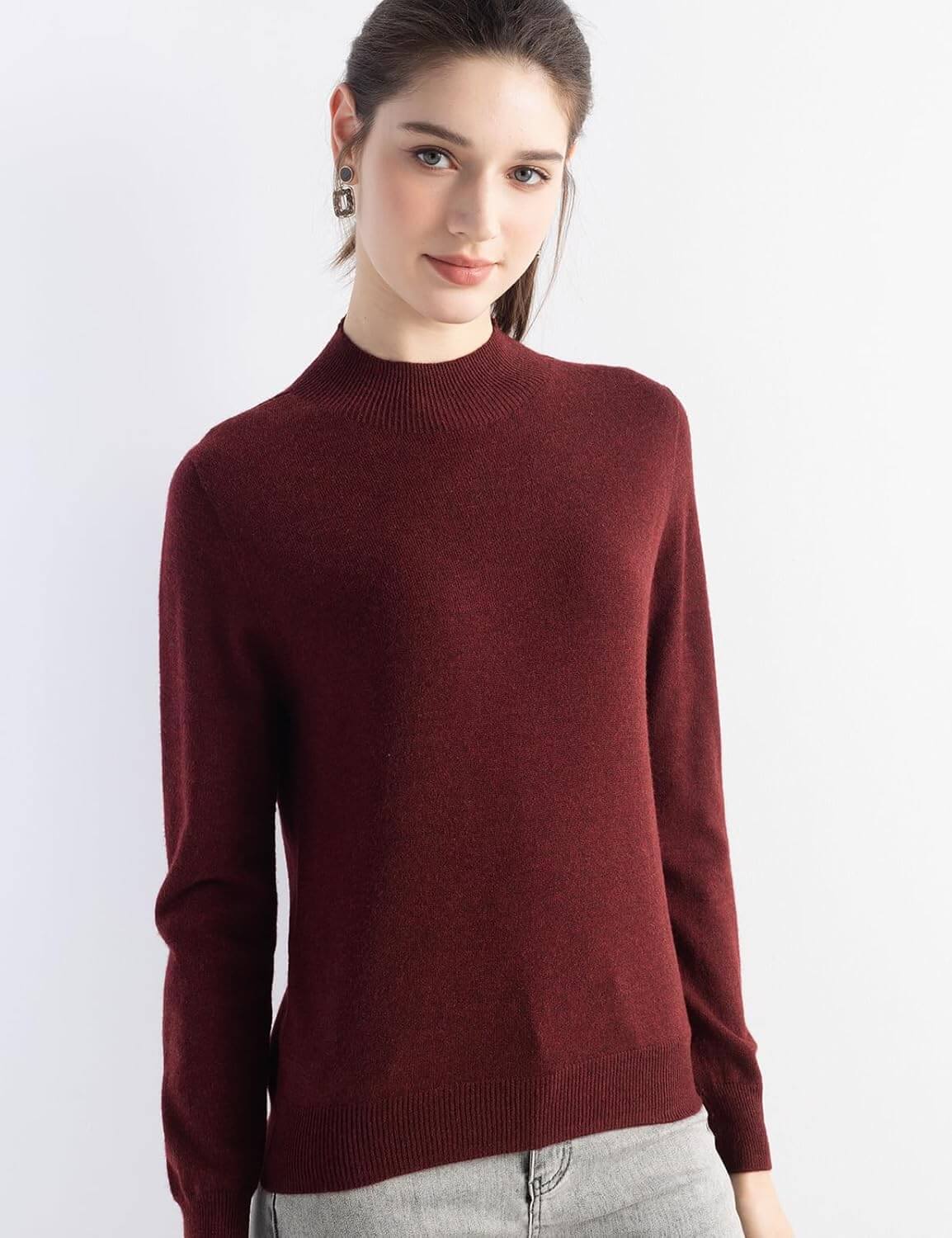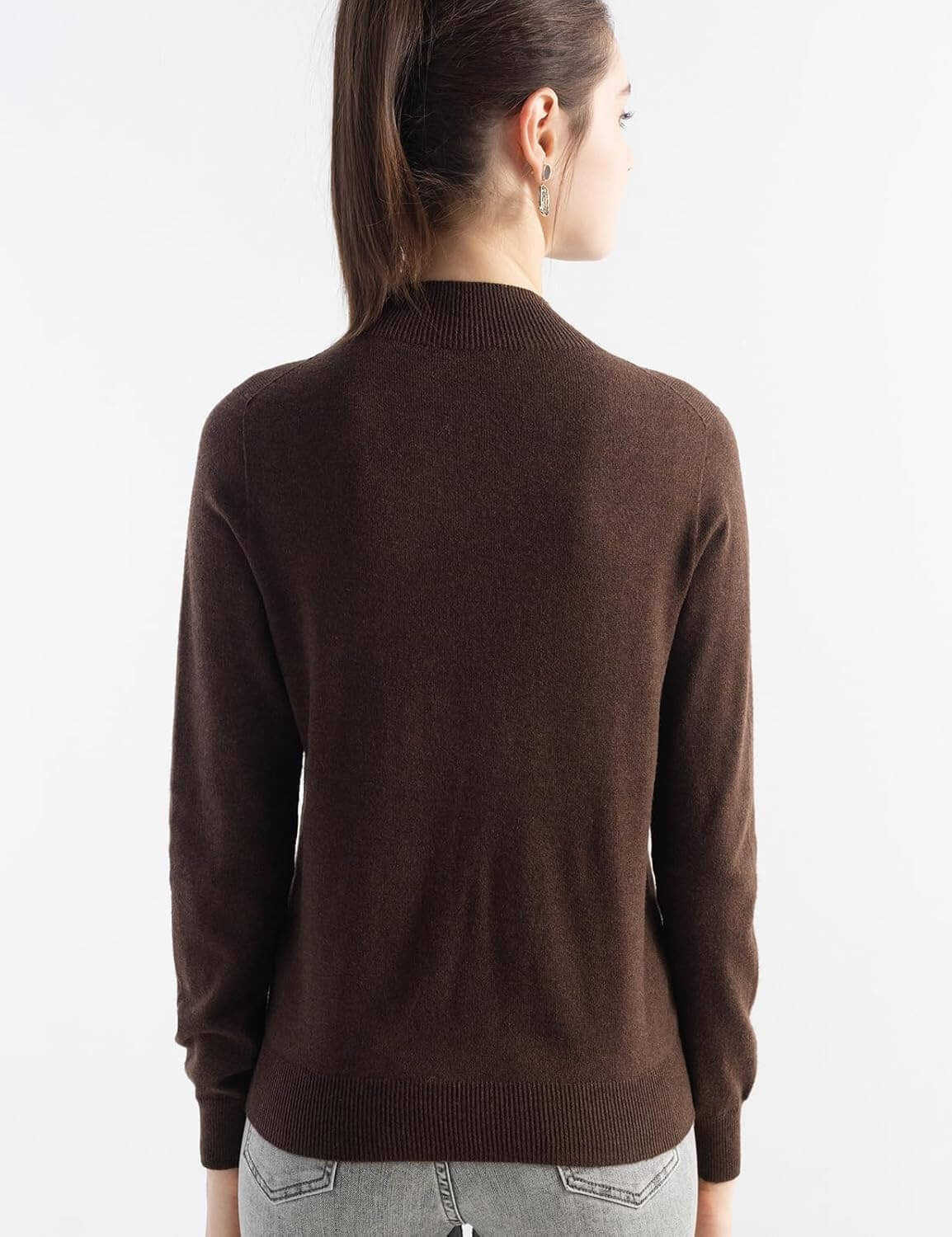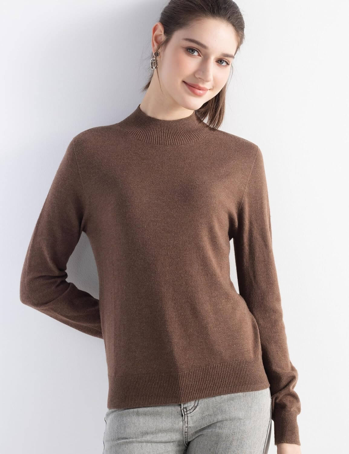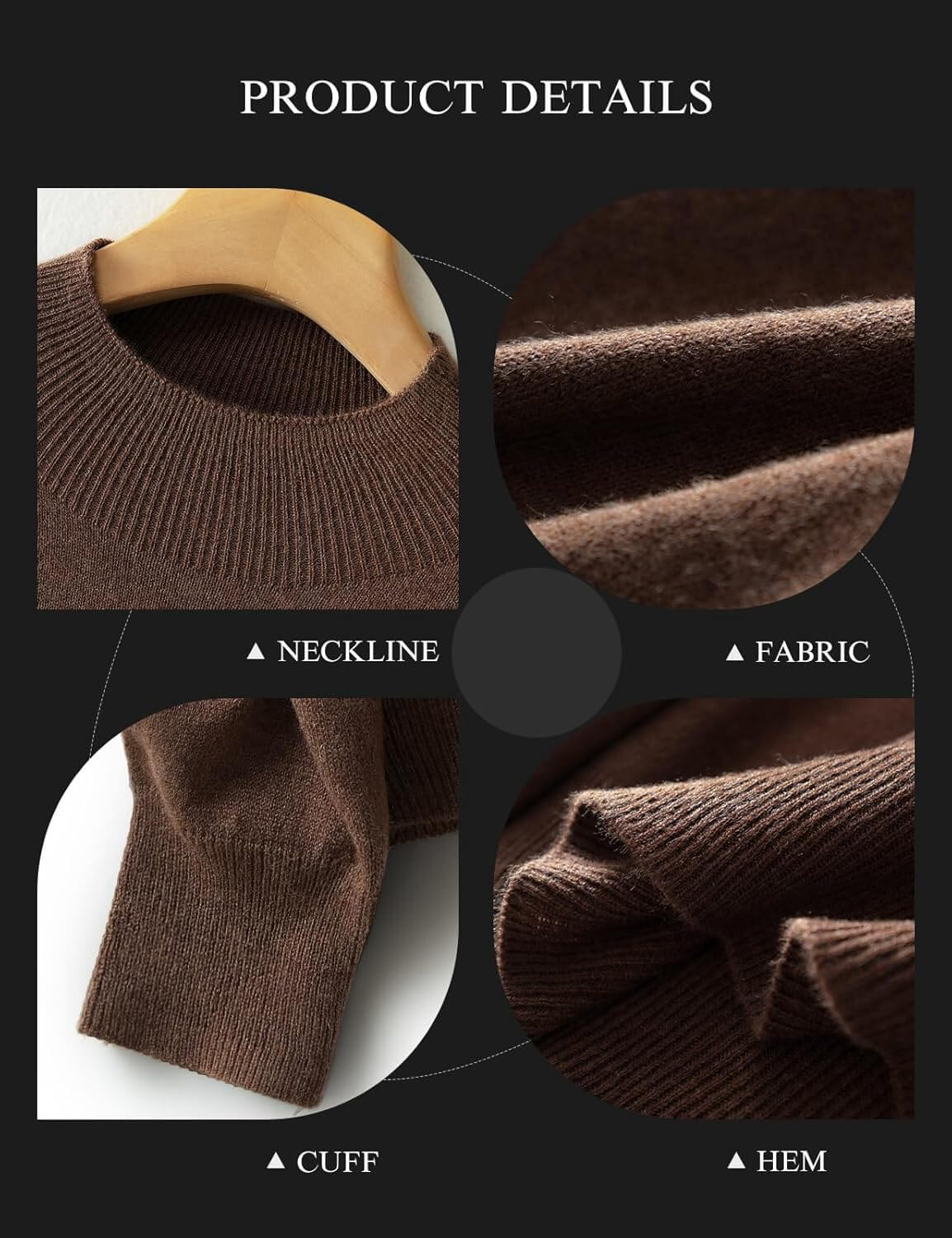 This sweater is perfect for fall. I plan on wearing it for the winter also but the espresso brown color is perfect for any autumn outfit. The fabric is not as soft as I would like but it is not itchy enough that I can't wear it. It fits very true to size, and the sleeves are a great length for us ladies with long arms. Very nice quality. I like that the mock neck does not come up too high to be annoying, it is a perfect cut. Overall great addition to your fall/winter wardrobe.