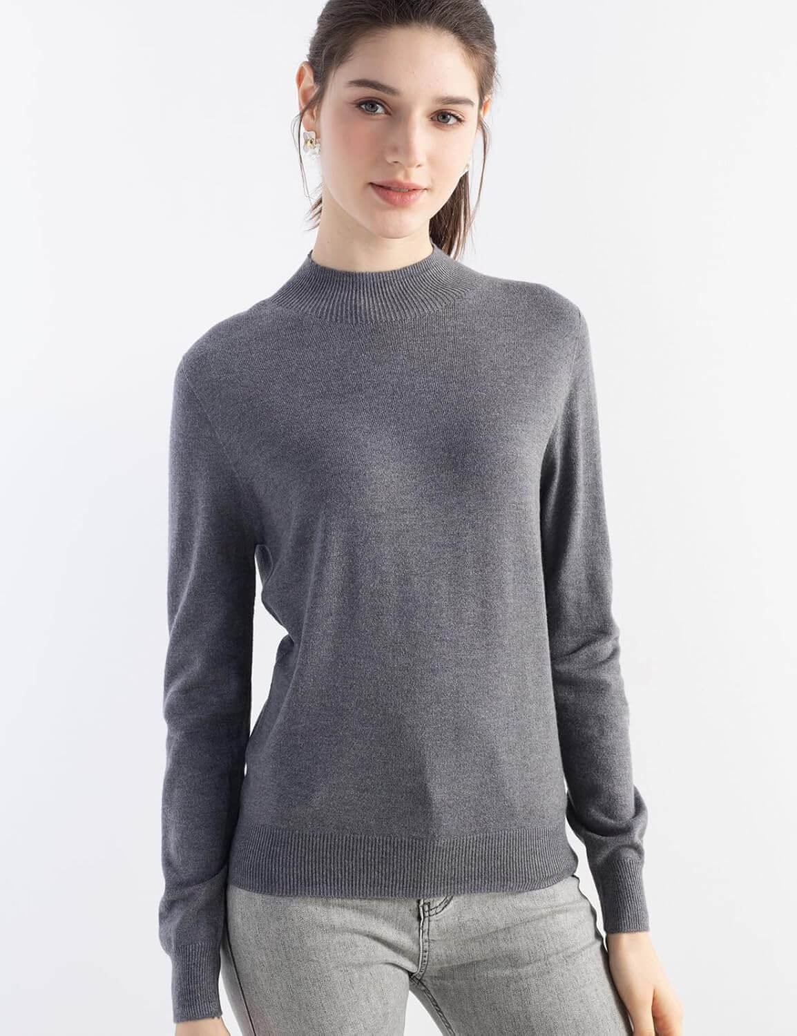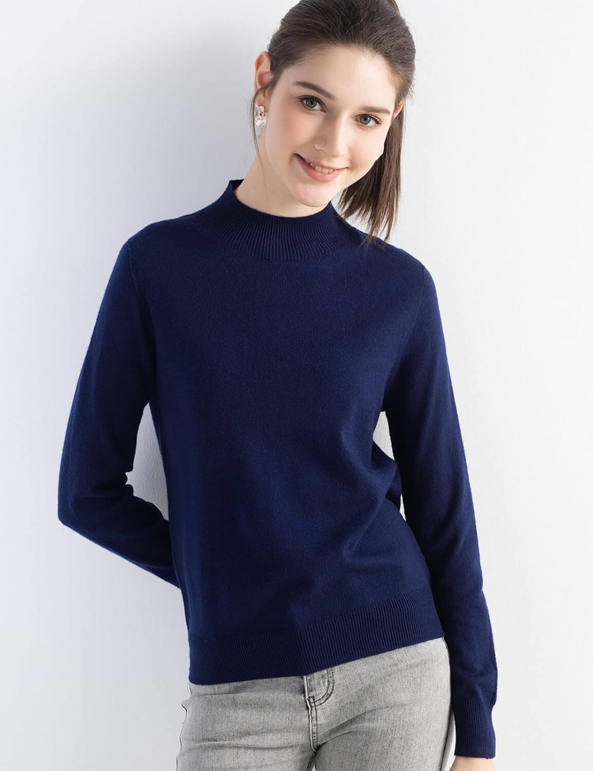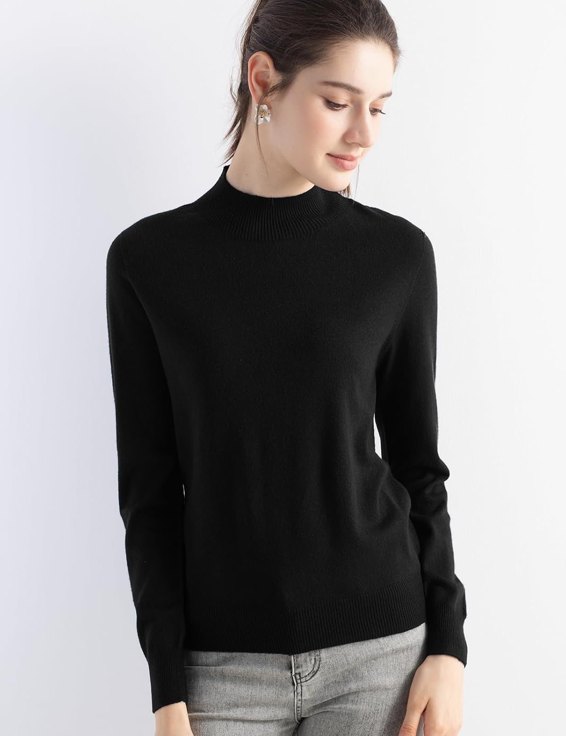 I have worn this sweater at least three times in the past 2 weeks as the weather has gotten chillier. It looks great with jeans but could also be worn with dressier pants or a skirtThe material itself is of good quality for the price point. The color is exactly as pictured in the seller's listing photos. The neck is higher than the typical crew neck found on these sweaters. It's not quite a mock turtleneck, but it's definitely higher than the standard crewneck sweater, which is a nice feature on chilly mornings!I've worn this sweater three times and it is not pilling at all, so I'm hopeful it will stay nice looking. If it begins to pill, I will update this review.If you are seeking a basic fall sweater to wear under blazers or to layer, this is a good option. It's soft, comfortable, and it was true to fit in my normal size.
