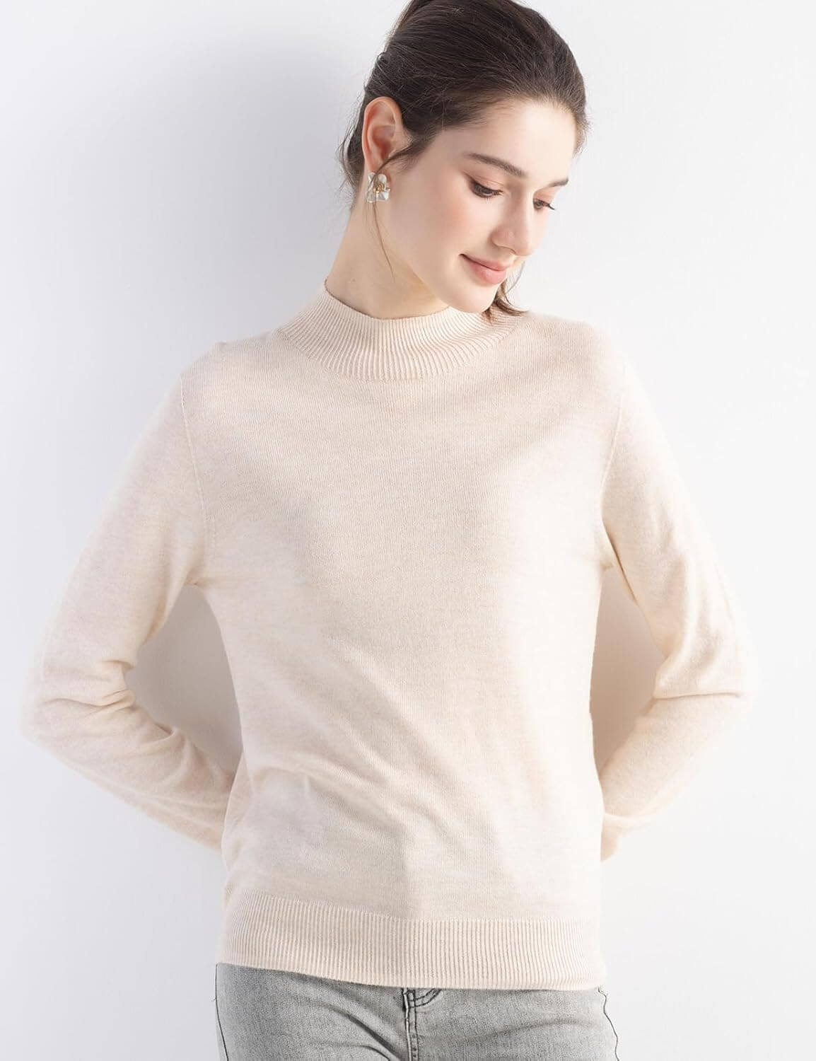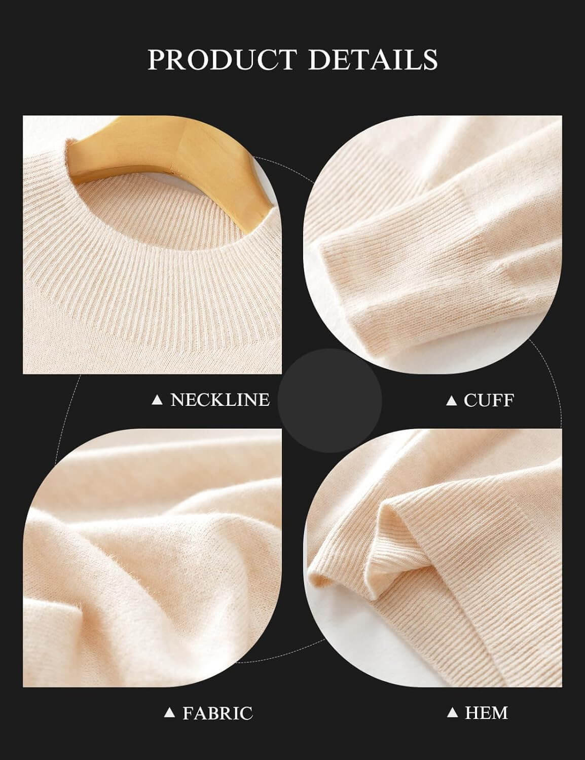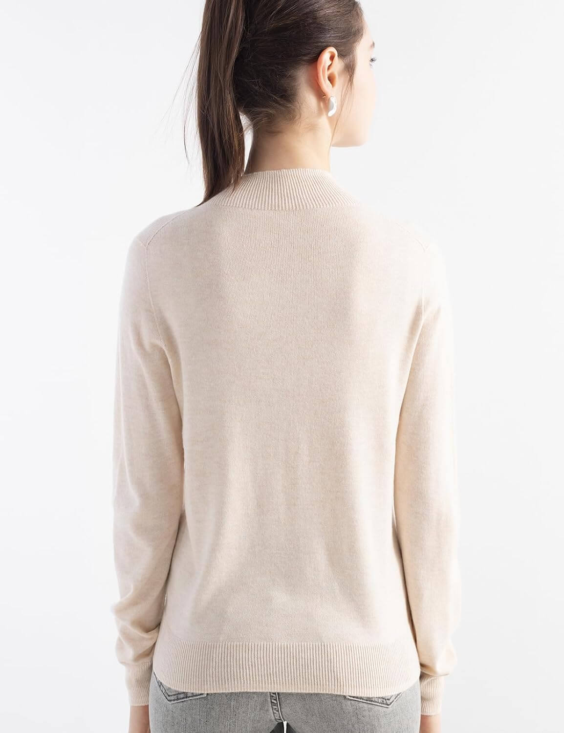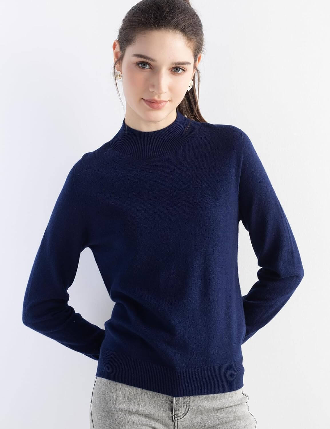 I have worn this sweater at least three times in the past 2 weeks as the weather has gotten chillier. It looks great with jeans but could also be worn with dressier pants or a skirtThe material itself is of good quality for the price point. The color is exactly as pictured in the seller's listing photos. The neck is higher than the typical crew neck found on these sweaters. It's not quite a mock turtleneck, but it's definitely higher than the standard crewneck sweater, which is a nice feature on chilly mornings!I've worn this sweater three times and it is not pilling at all, so I'm hopeful it will stay nice looking. If it begins to pill, I will update this review.If you are seeking a basic fall sweater to wear under blazers or to layer, this is a good option. It's soft, comfortable, and it was true to fit in my normal size.