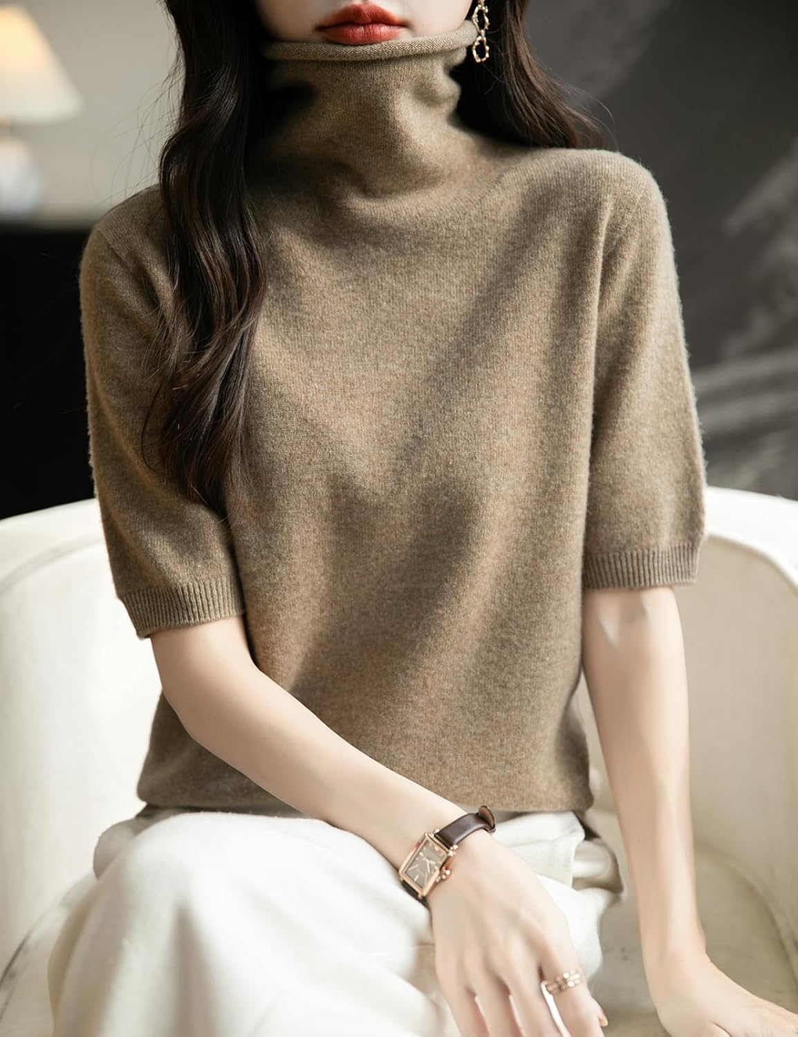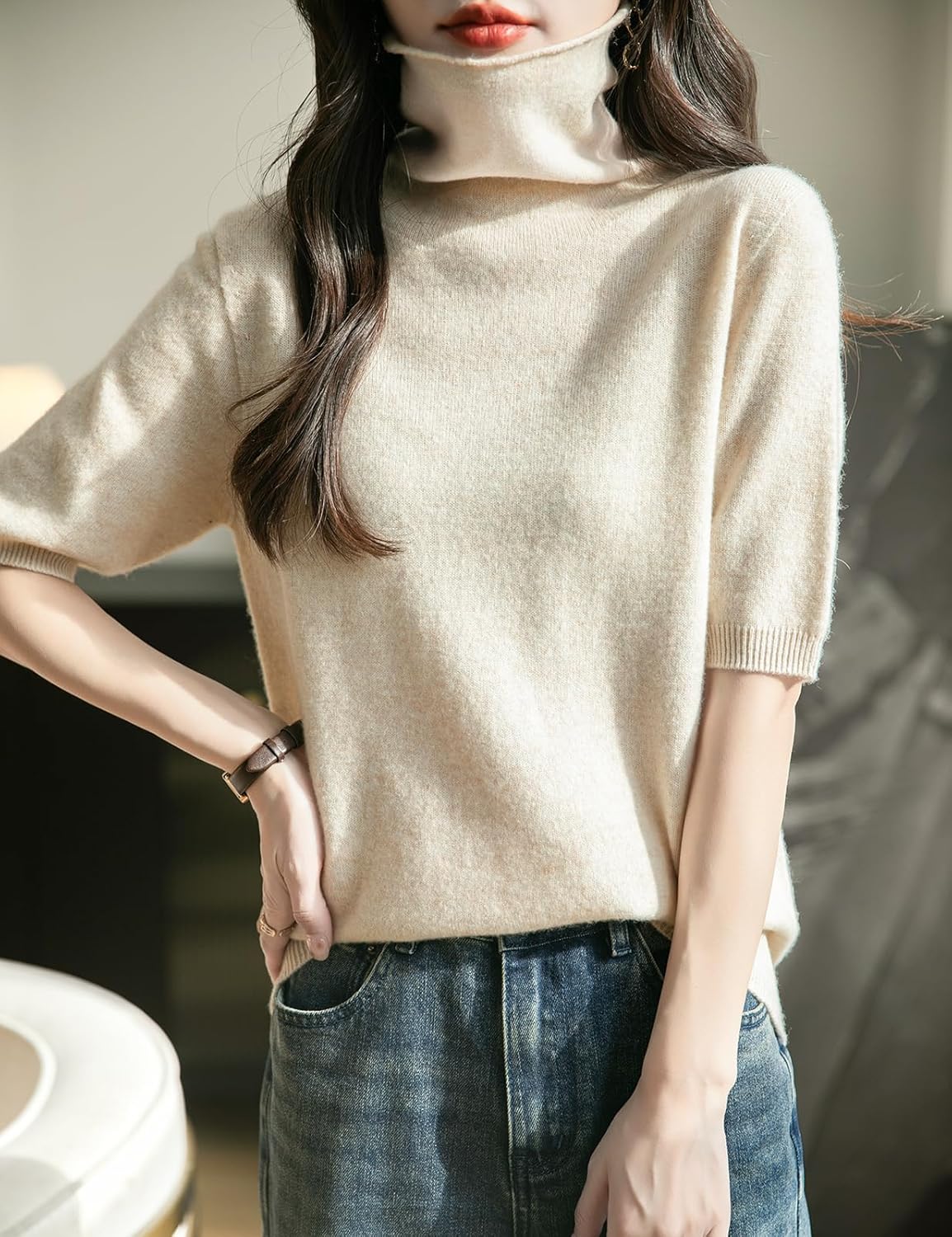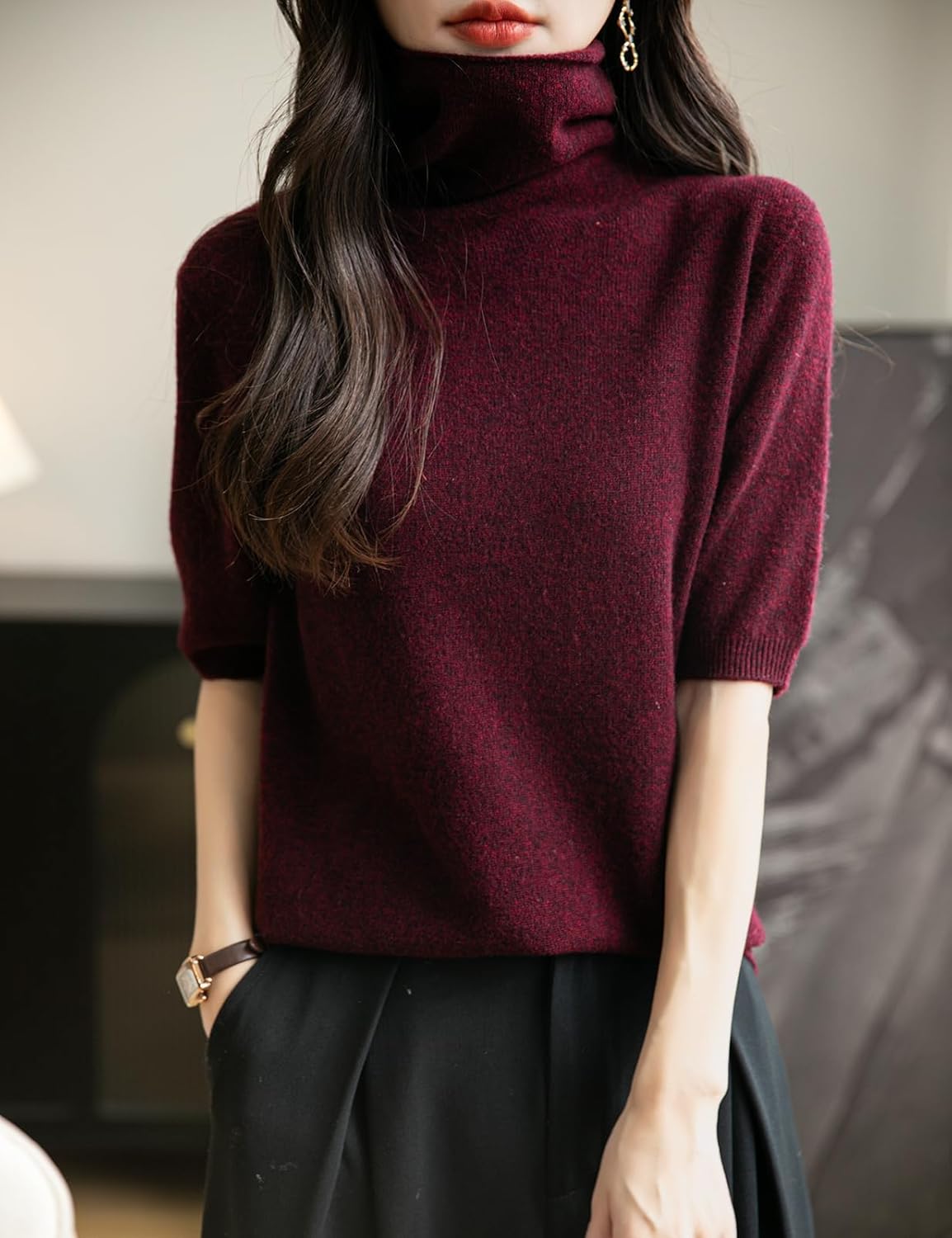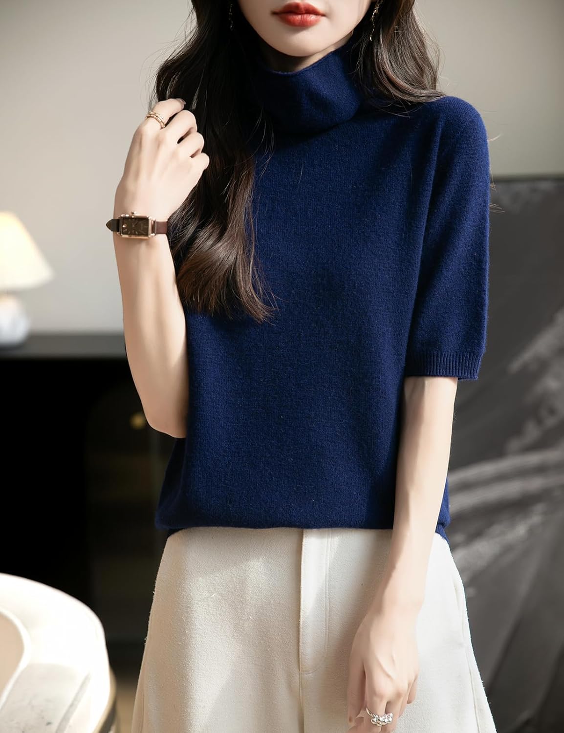 100% 메리노 울 터틀넥 반팔 심리스 스웨터