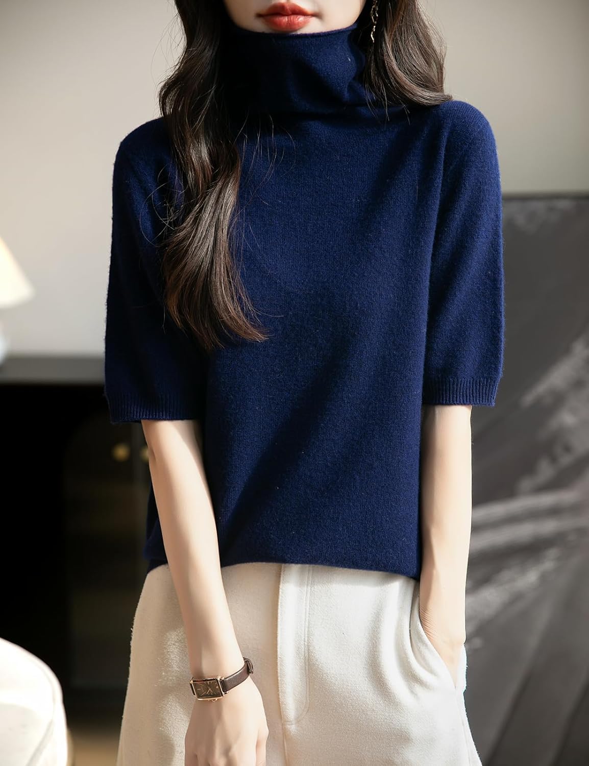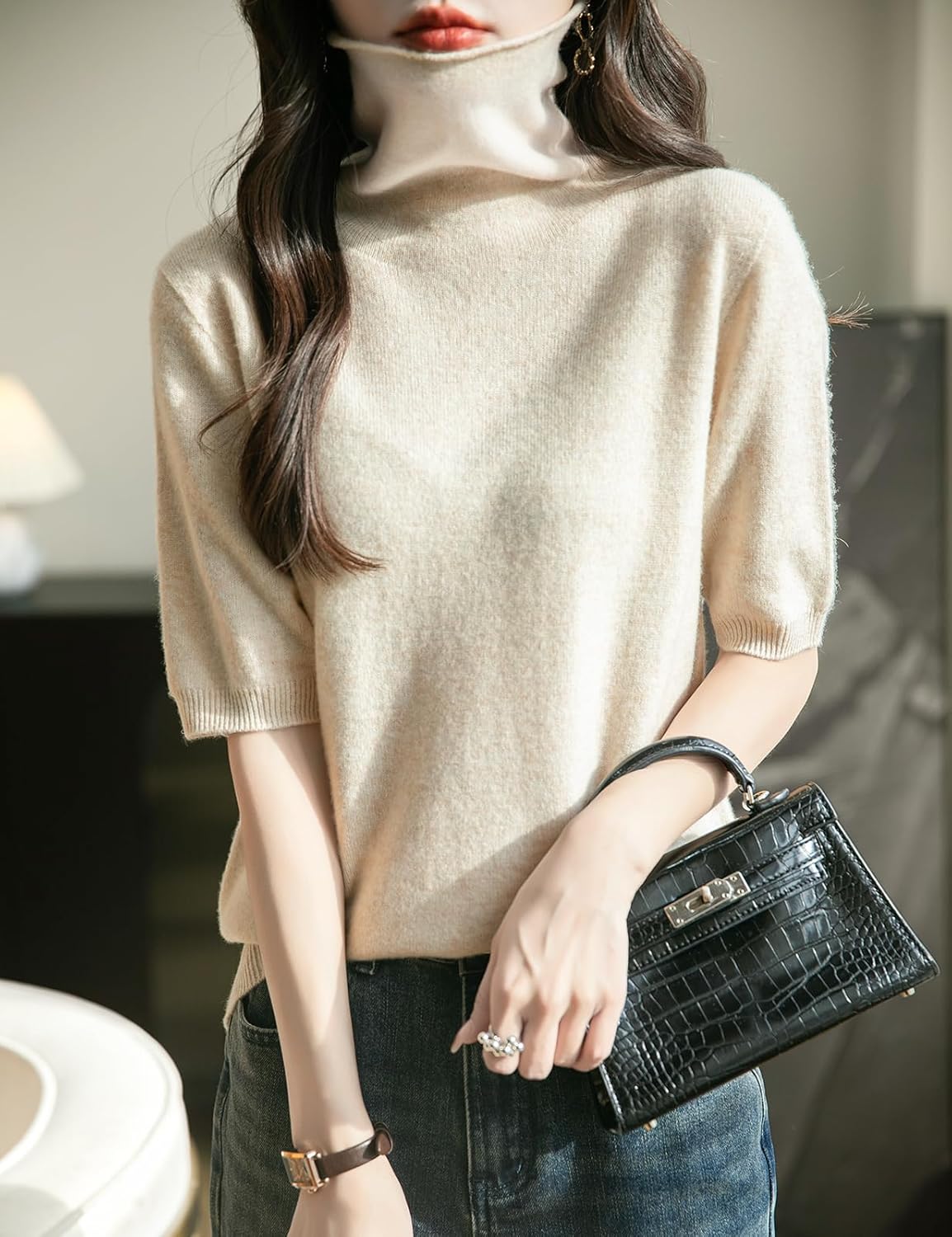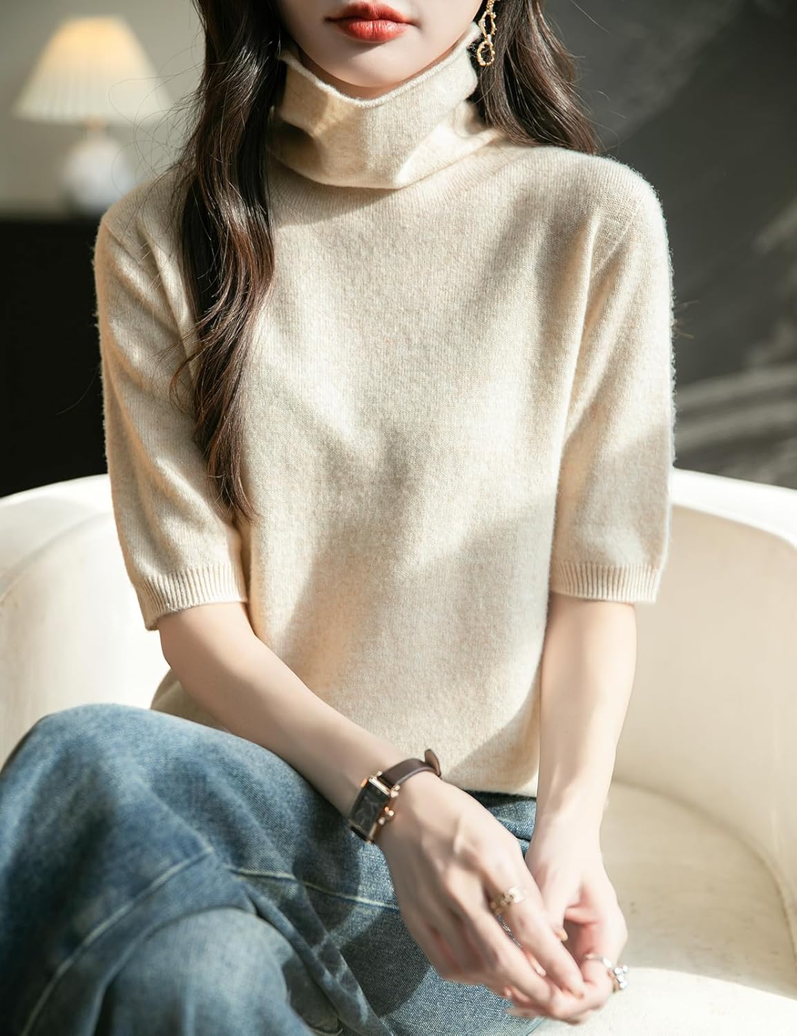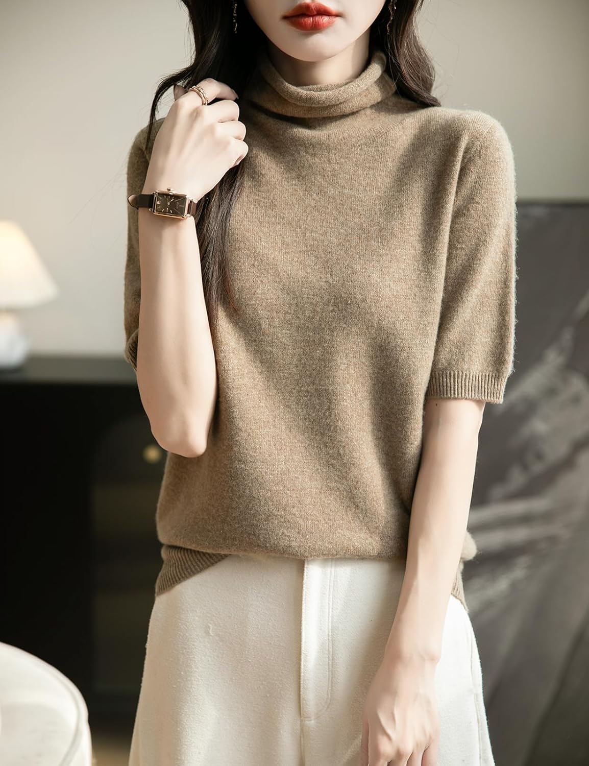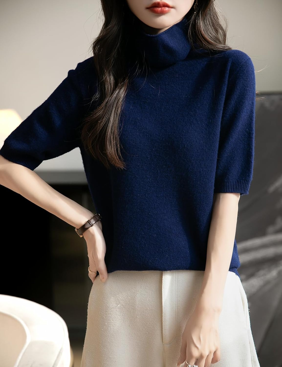 100% 메리노 울 터틀넥 반팔 심리스 스웨터