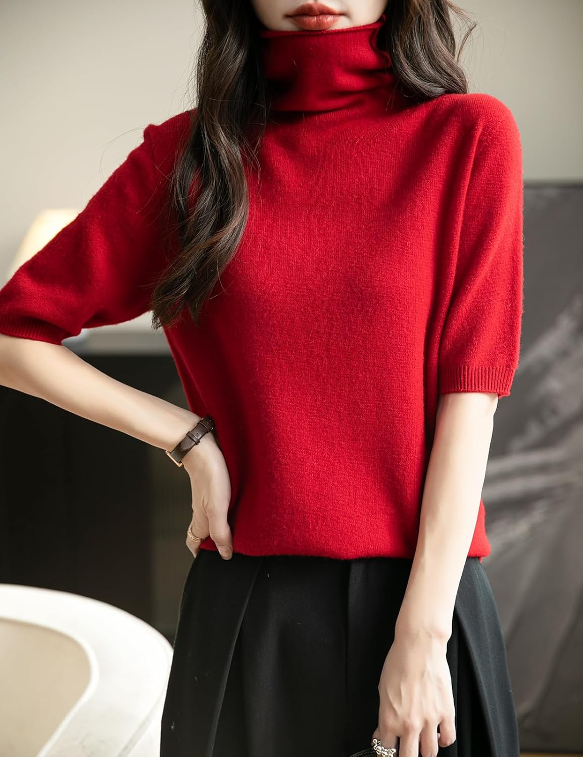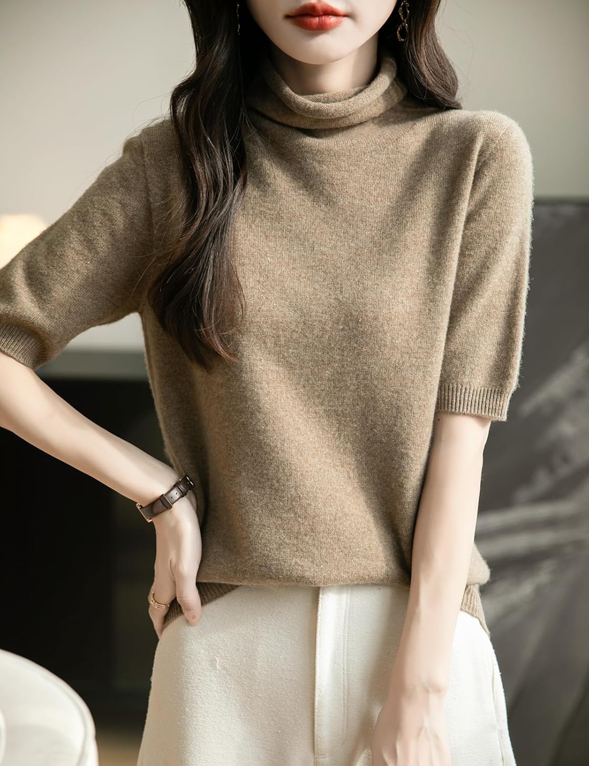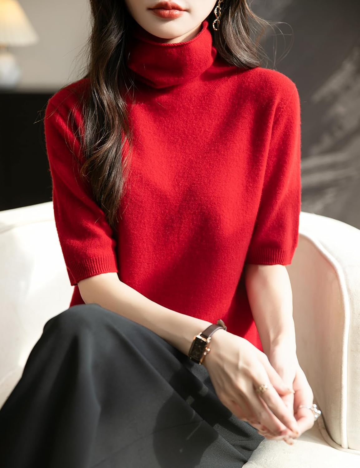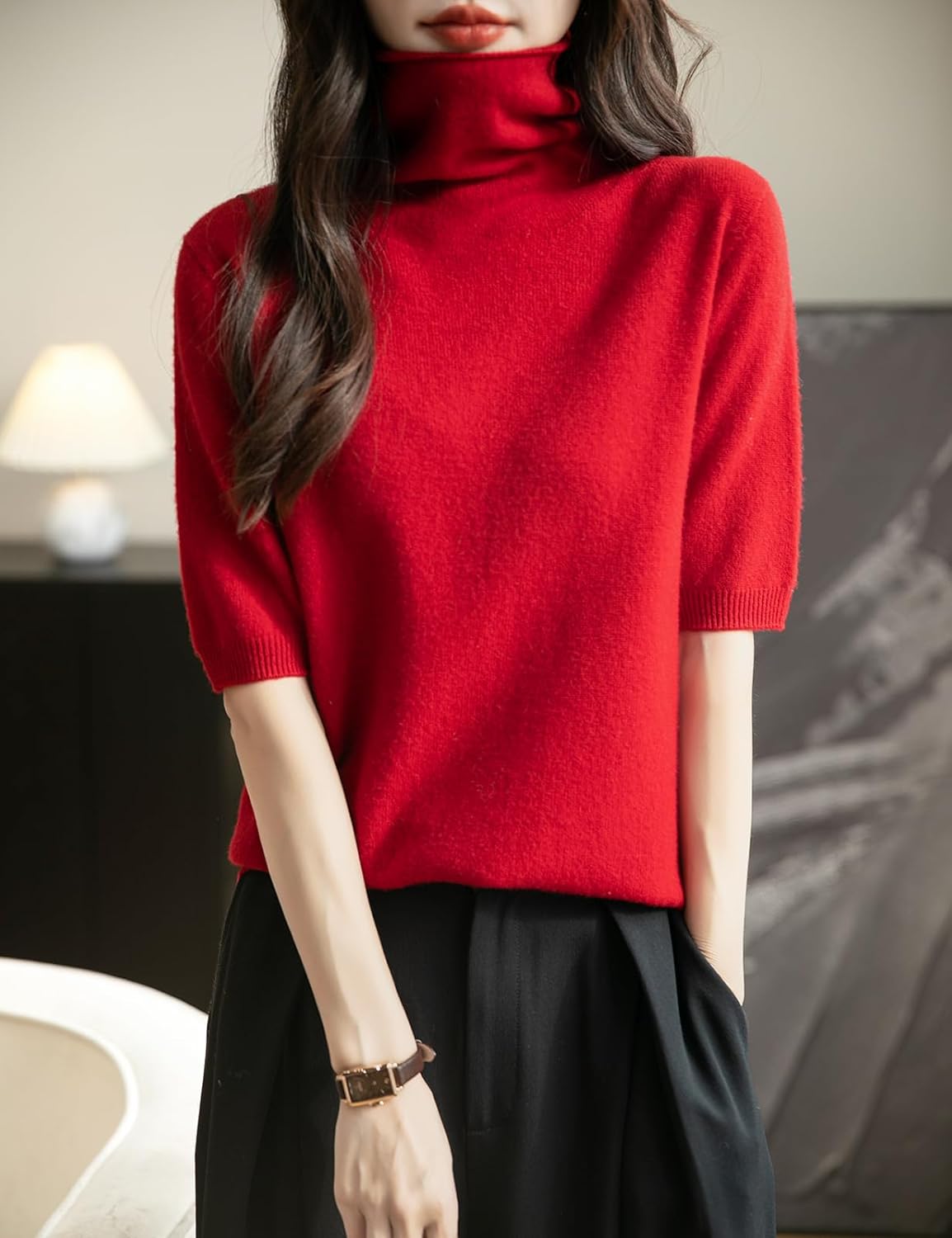 100% 메리노 울 터틀넥 반팔 심리스 스웨터