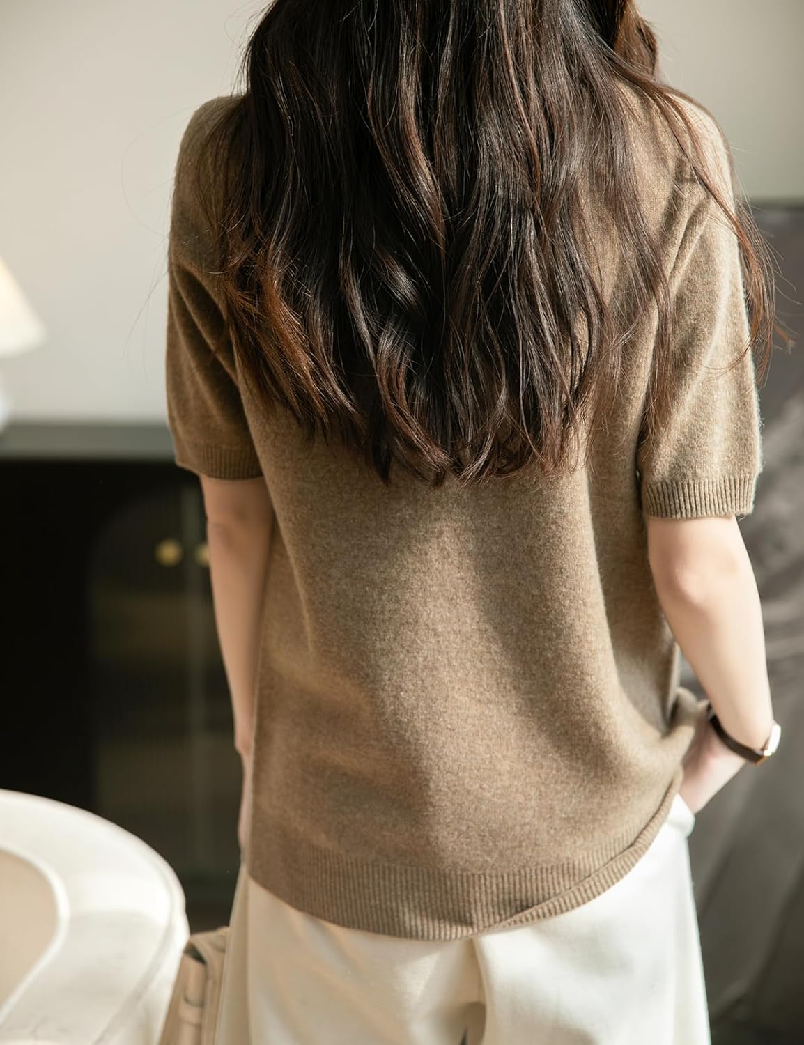 I like this half-sleeve sweater so much. It’s uncommon to find shorter sleeve wool tops. This is great to wear in coolish to moderate weather or wear a long sleeve shirt under it for extra warmth. It is 100 merino wool and very soft. I can wear it against my skin without it causing itchiness. The material is lightweight, but densely knitted, so it provides a good layer of insulation. I machine wash it on delicate and lay it flat on a laundry rack to air dry. I’m 5’2” and about 105 pounds; I usually wear a size small, but ordered a medium so it would be loose and comfy. I have multiple wool items from this brand and they are all excellent quality.