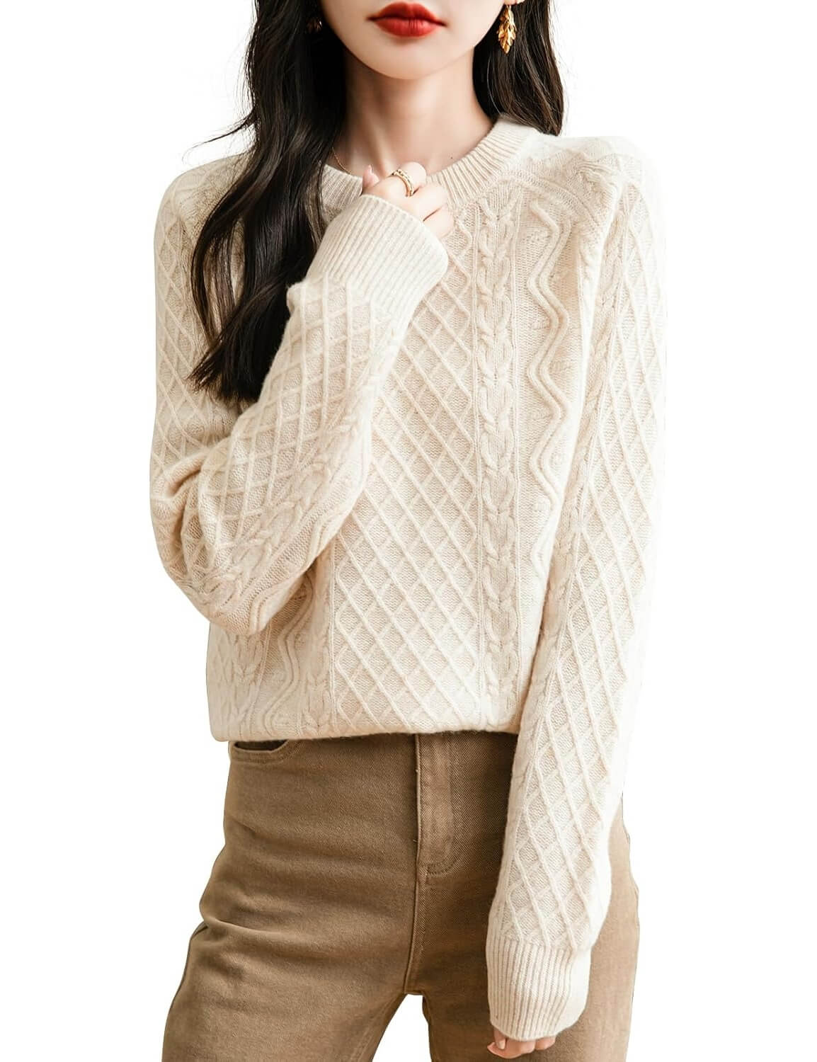 Kabeltrui met ronde hals van 100% merinowol