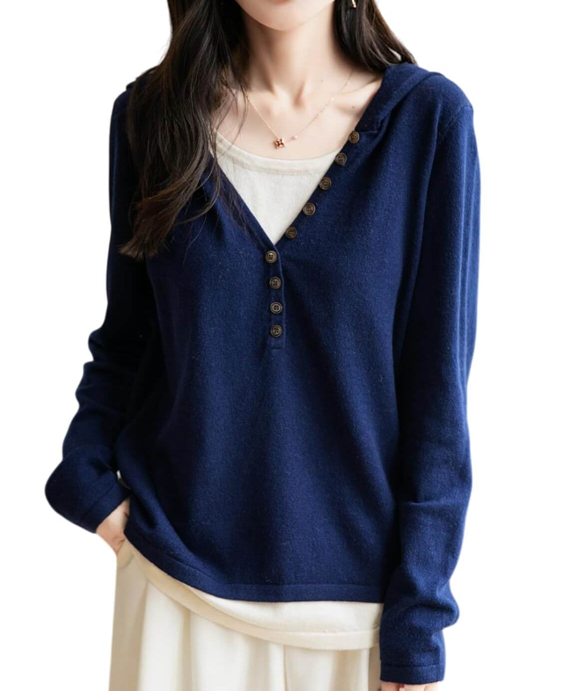 Merino Wool Blend Color Block Fake Two-Piece Knit Hoodie