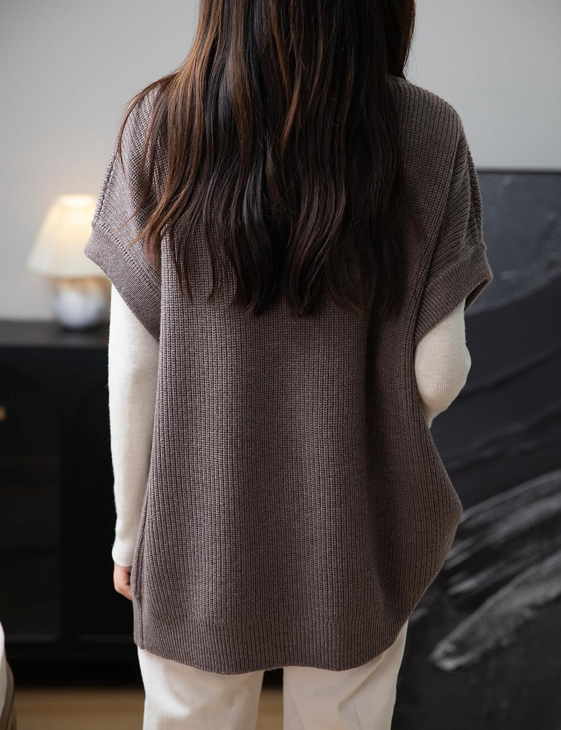 This is a well constructed, medium-weight, evenly woven sweater vest made of soft, breathable material that wears comfortably alone, or over a turtleneck. Fit is a generous TTS, and I love that it's somewhat oversized, which adds to the comfort level. This sweater vest transitions well from casual to office wear, and the quality is what I've come to expect and appreciate from this brand. Another great addition to my wardrobe, and a great value based on quality, design and construction. I'm pleased with this sweater vest, and recommend it.