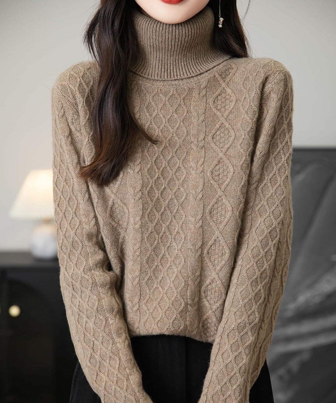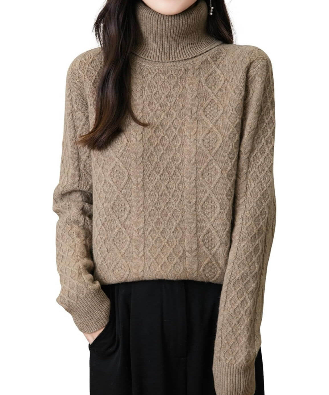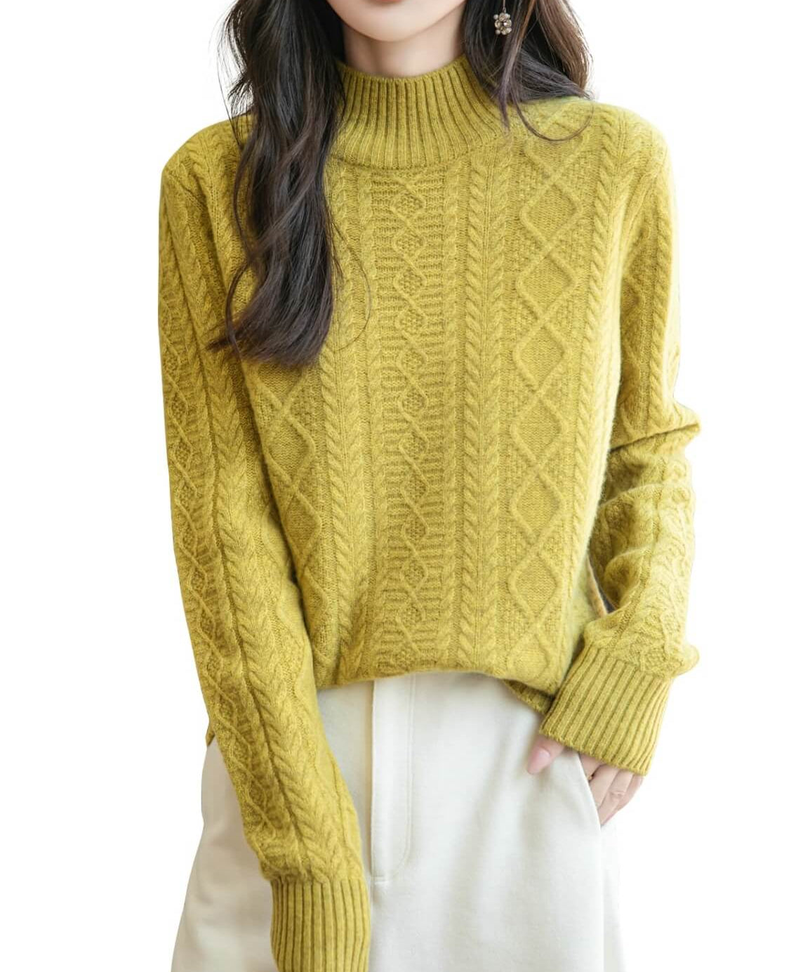 Suéter feminino 100% lã Merino com gola alta sólida