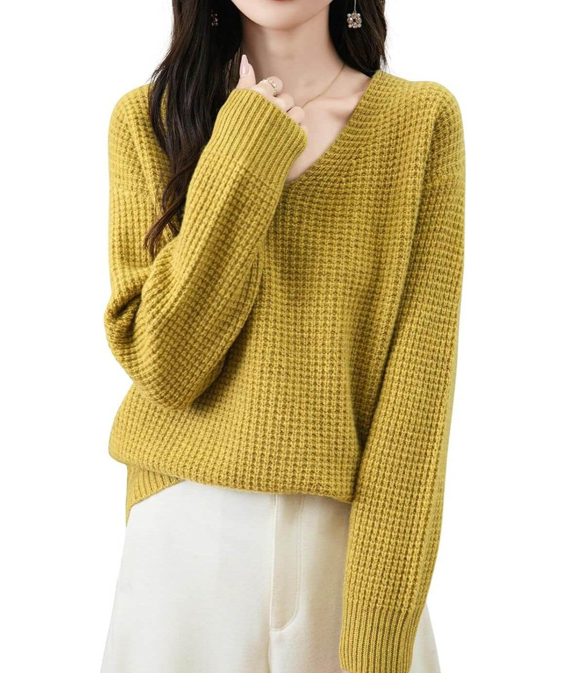 Suéter de malha waffle 100% lã Merino com decote em V