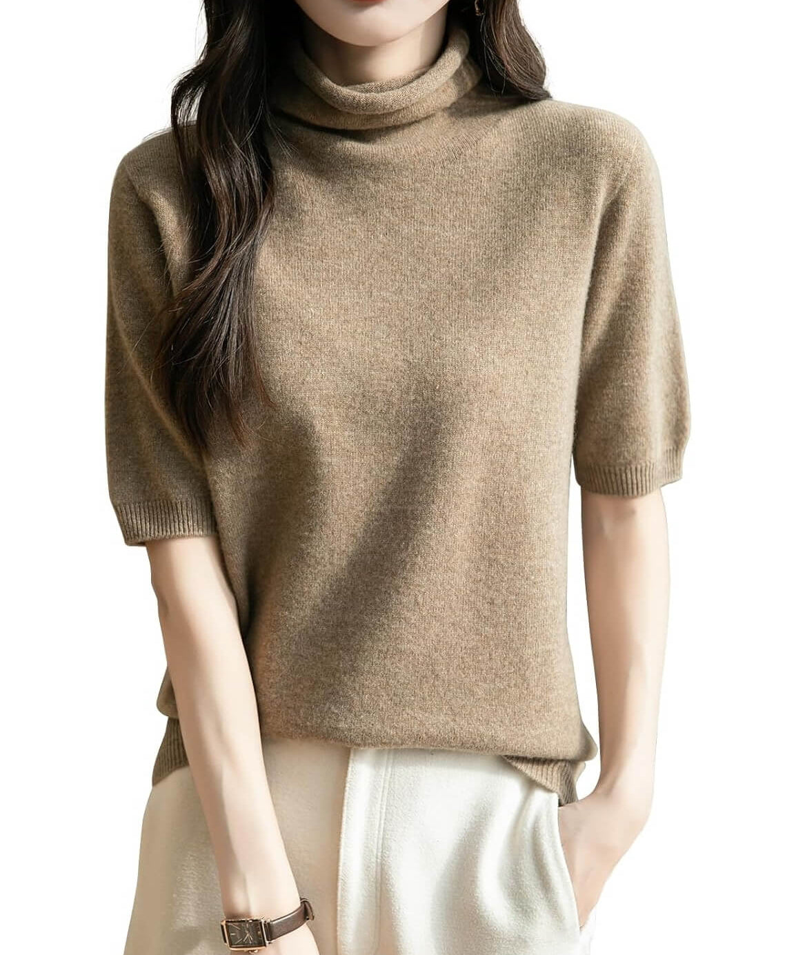 Suéter sem costura 100% lã Merino com gola alta e manga curta