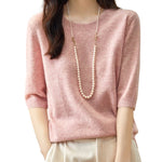 A woman wearing a pink crewneck merino wool sweater with half sleeves, paired with white trousers and accessorized with a long pearl necklace.