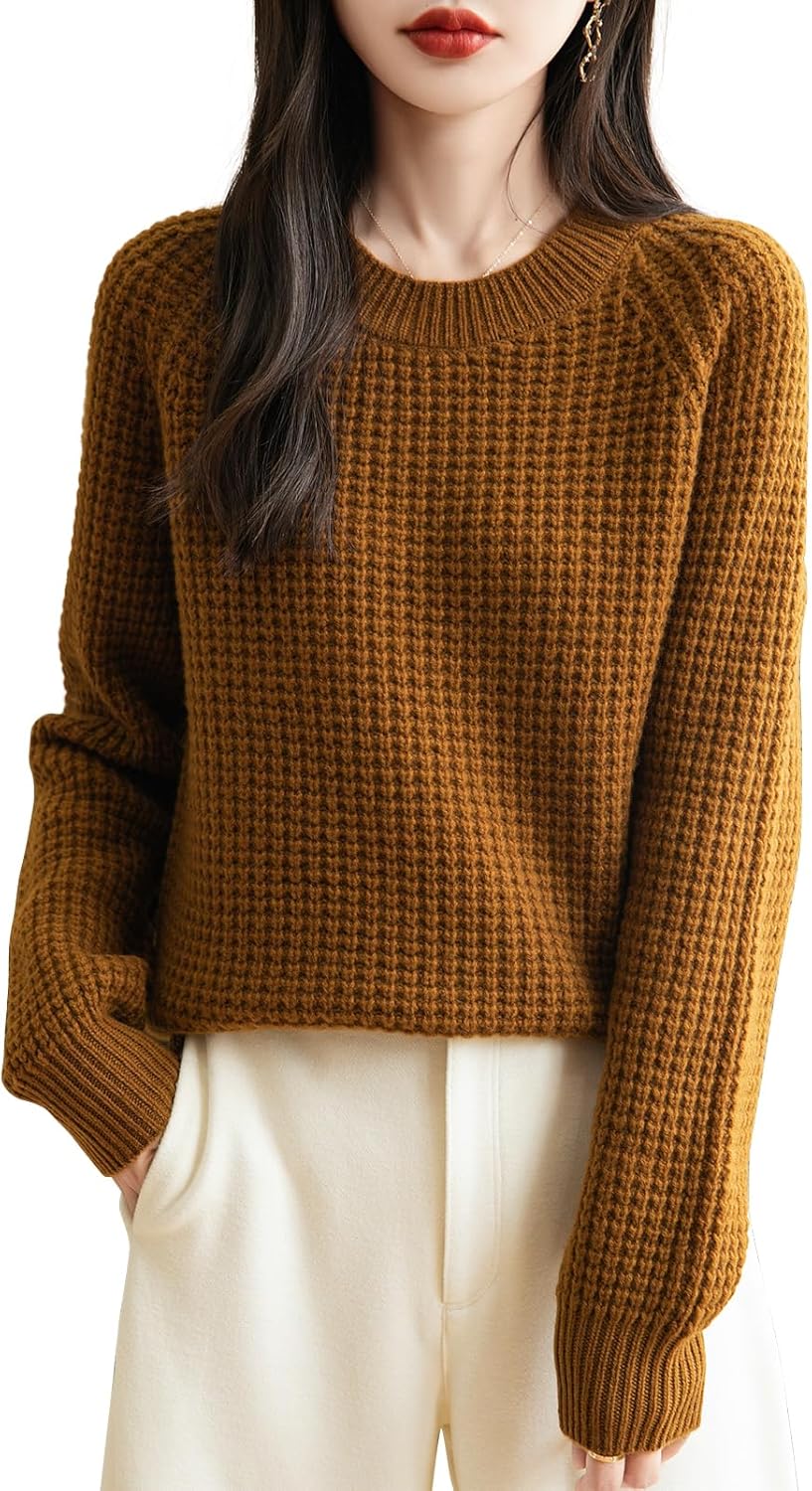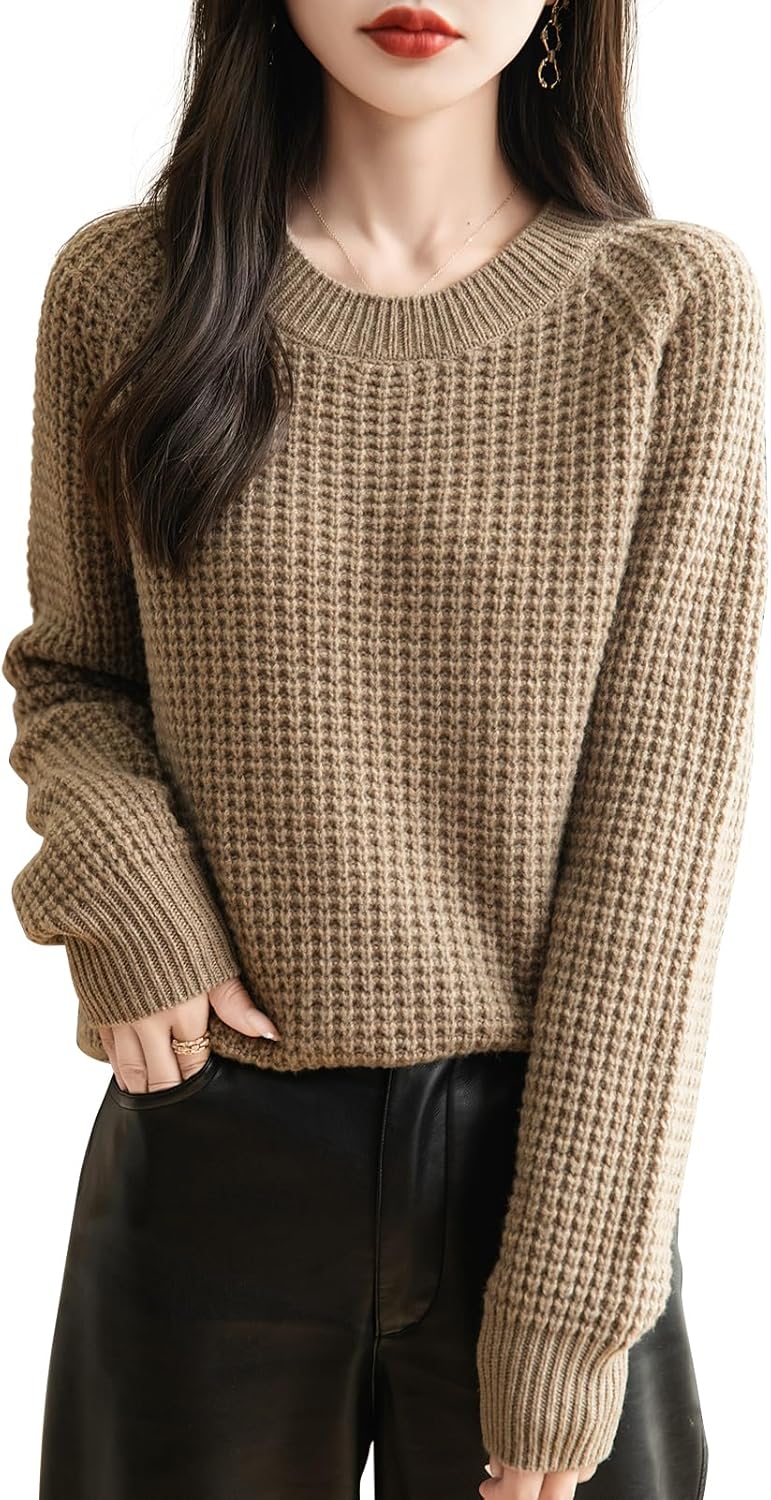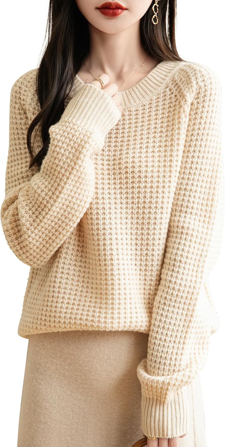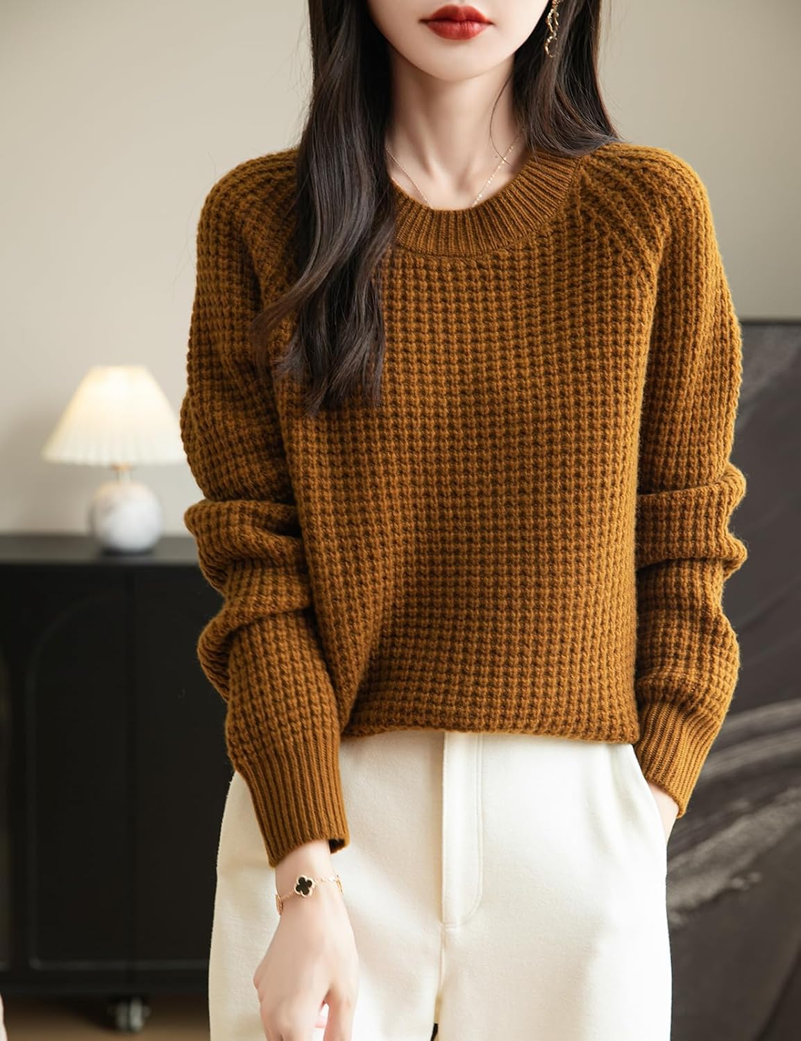 This merino wool sweater is pretty cozy for cooler weather. The waffle knit is warm and relatively stylish. It's a simple crewneck, long sleeve pullover. I’ve found it to be a little itchy, but I have very sensitive skin.
