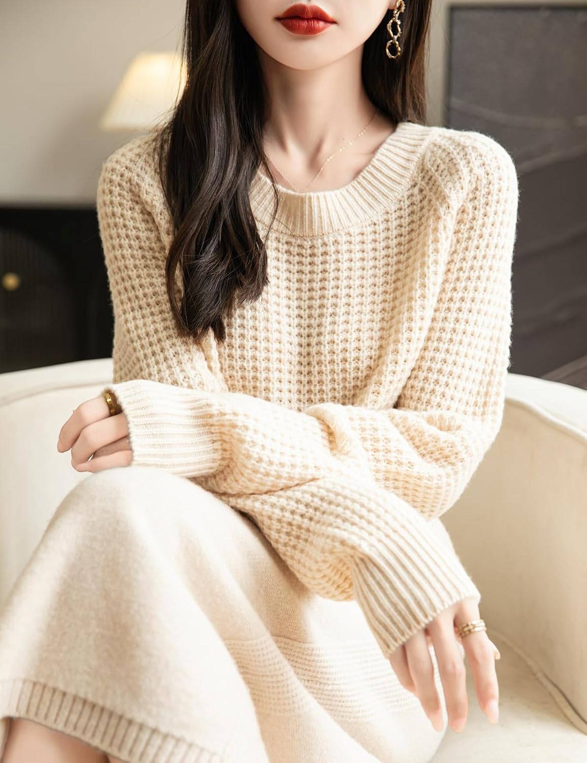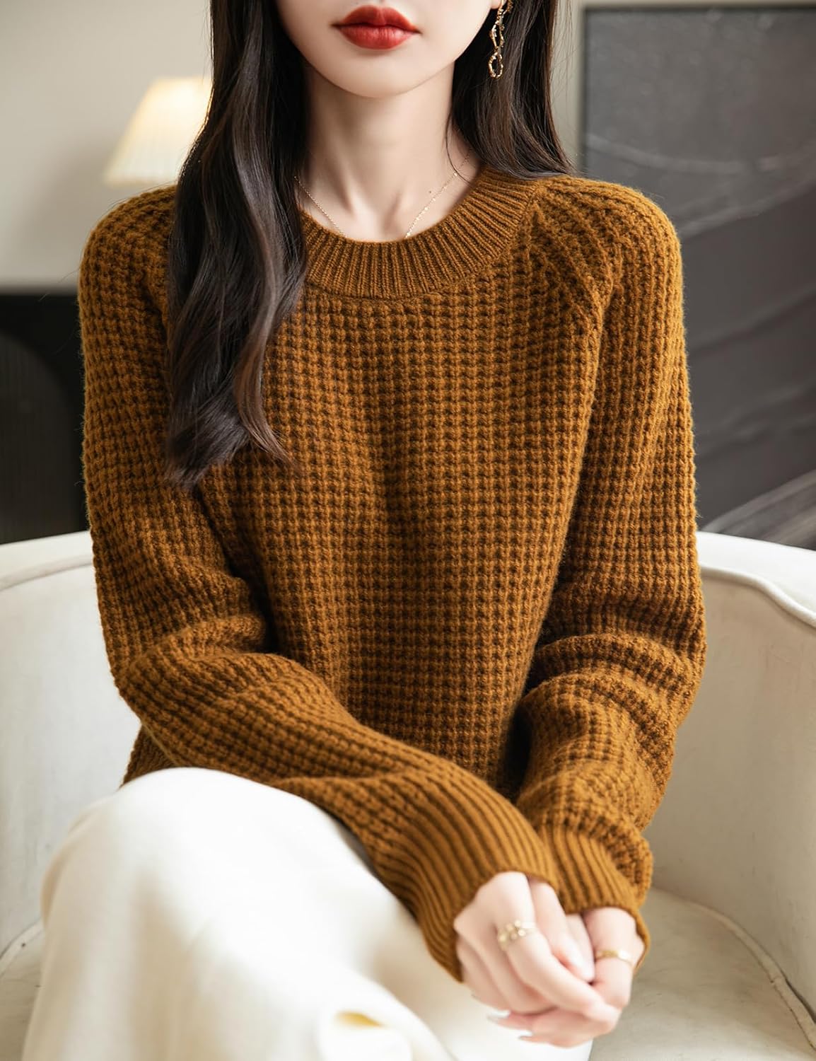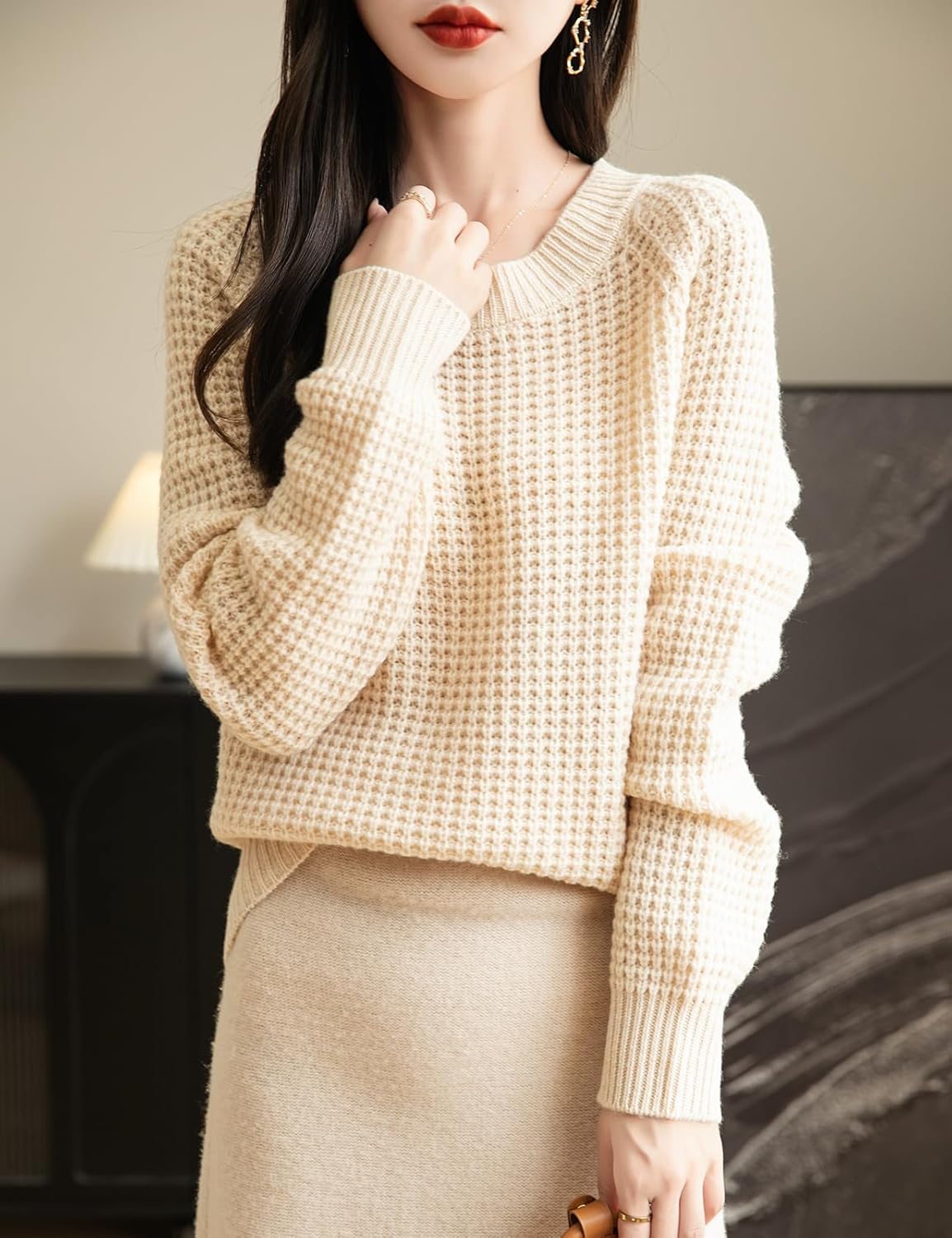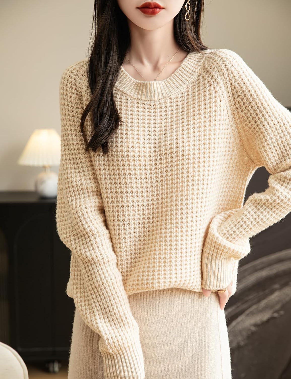 Suéter 100% lã merino waffle tricotado com gola redonda