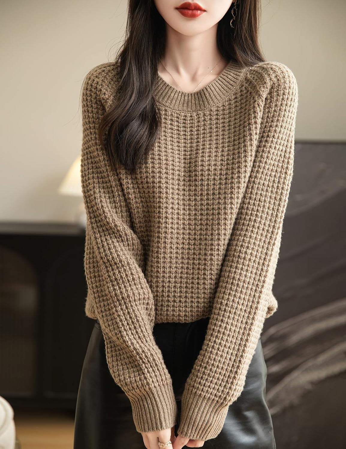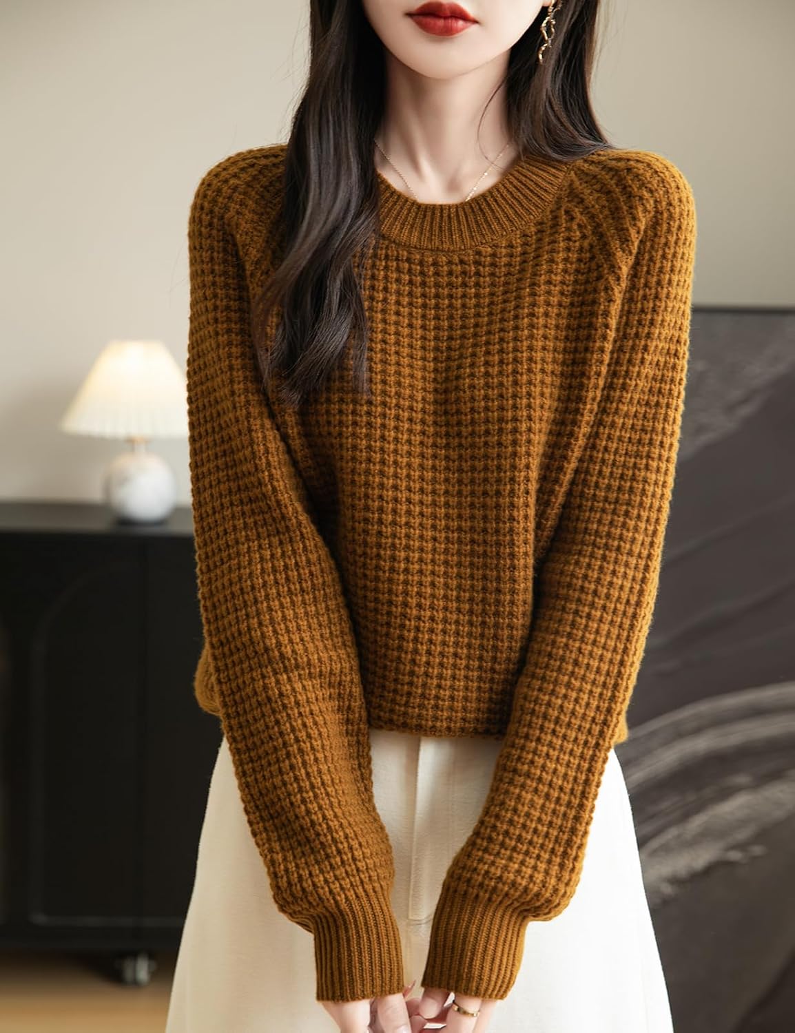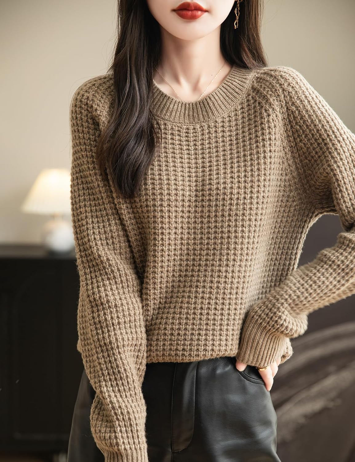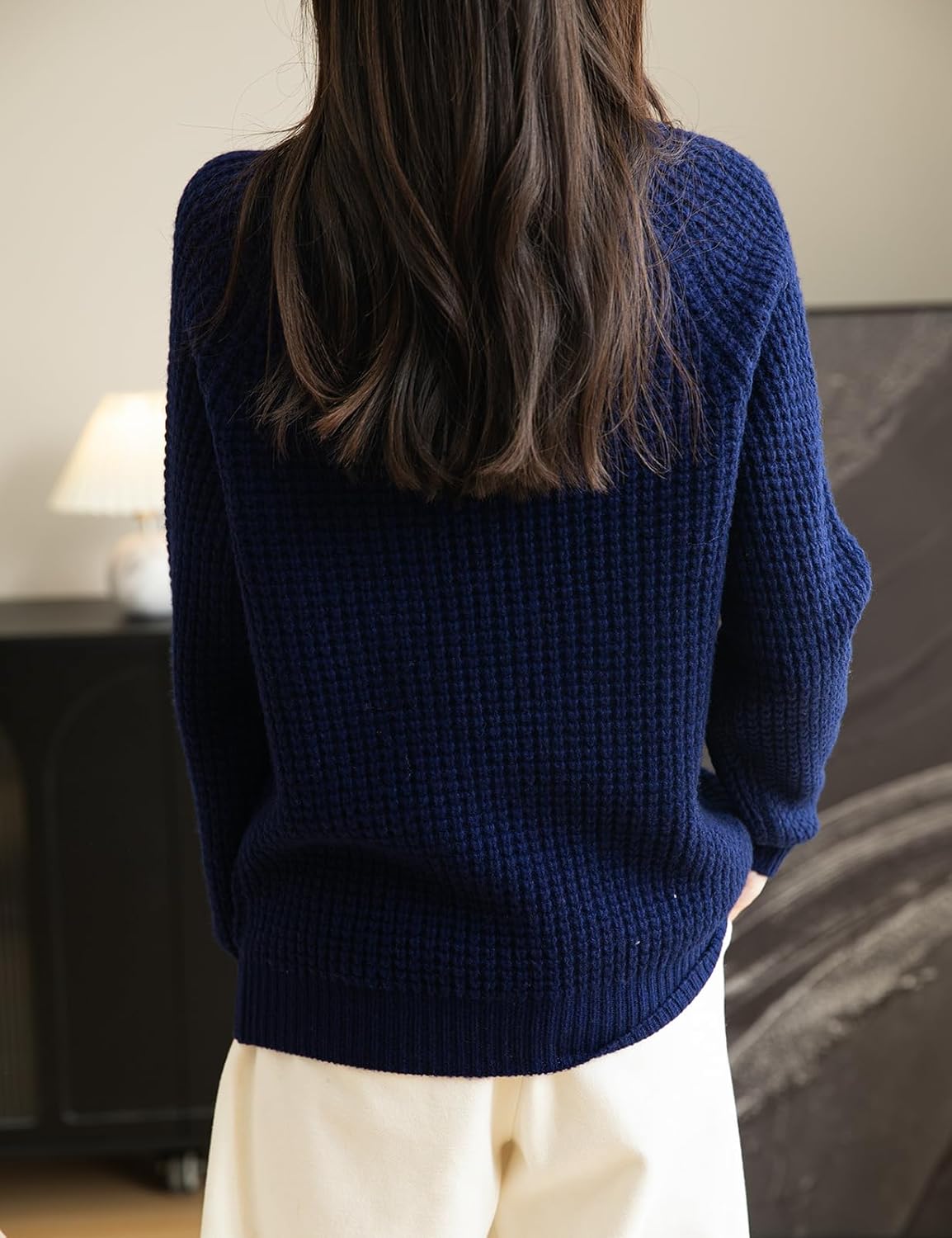Suéter 100% lã merino waffle tricotado com gola redonda