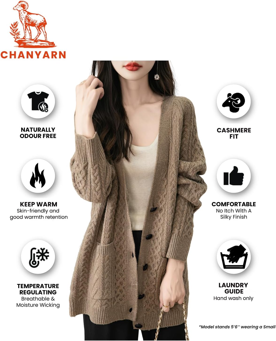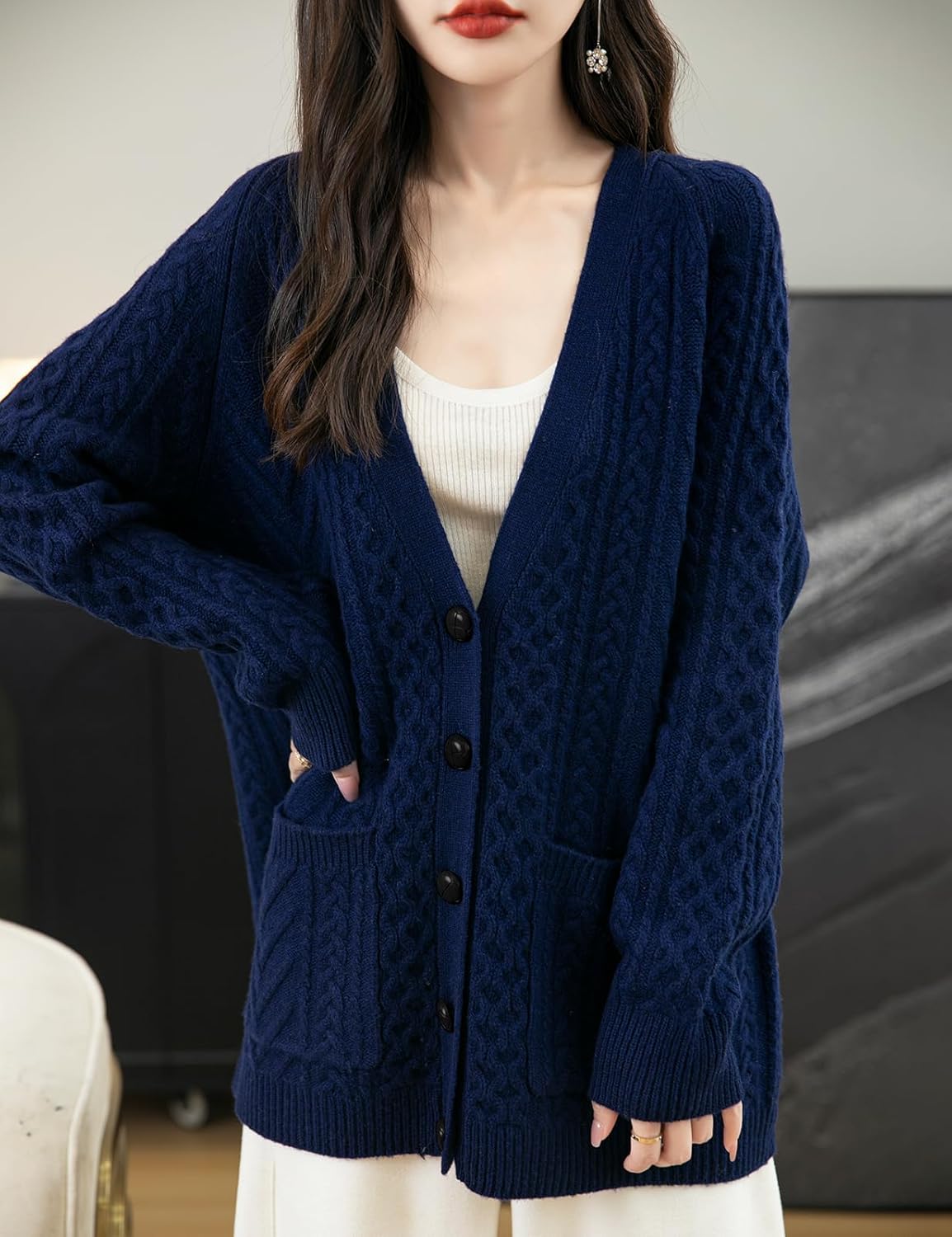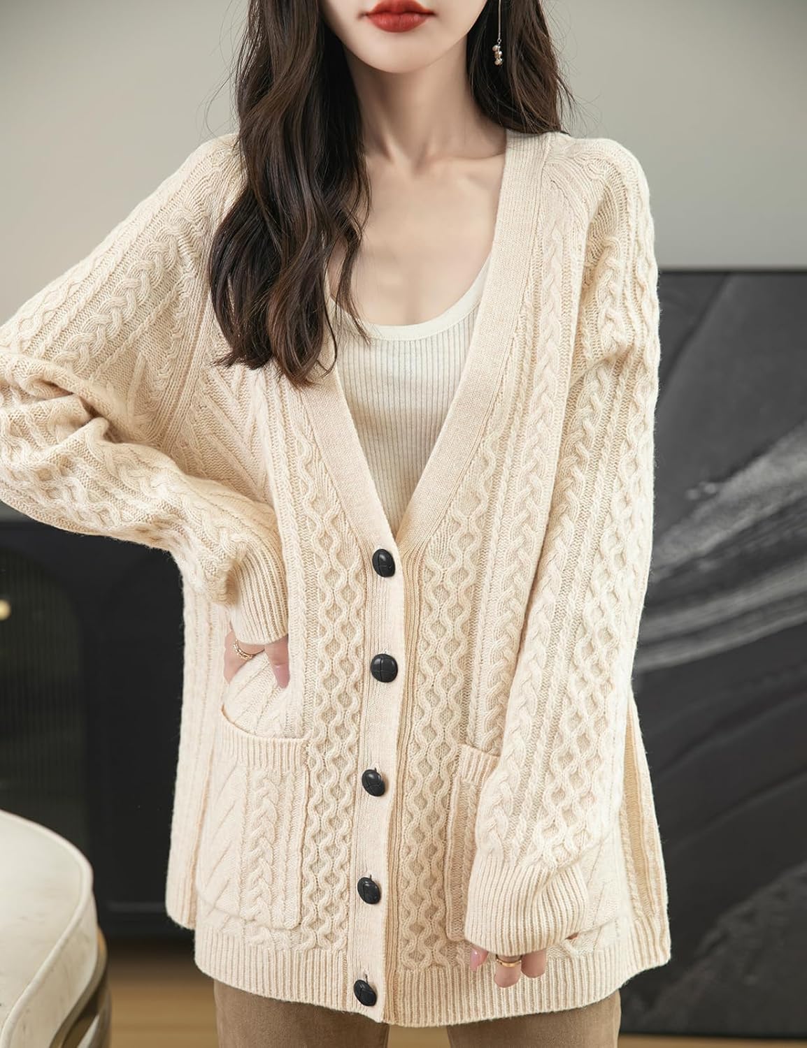 - Funktioner: Fint 5 gauge-tyg, tjockt. Normal passform, enfärgad, v-ringning, långa ärmar, klassisk kabelsömsdesign, ribbade ärmar. Hög elasticitet, avslappnad stil. Lätt, varm, mjuk, mycket bekväm att bära. Denna koftatröja i merinoull har ett unikt texturmönster som ger visuellt intresse och charm till din vintergarderob.