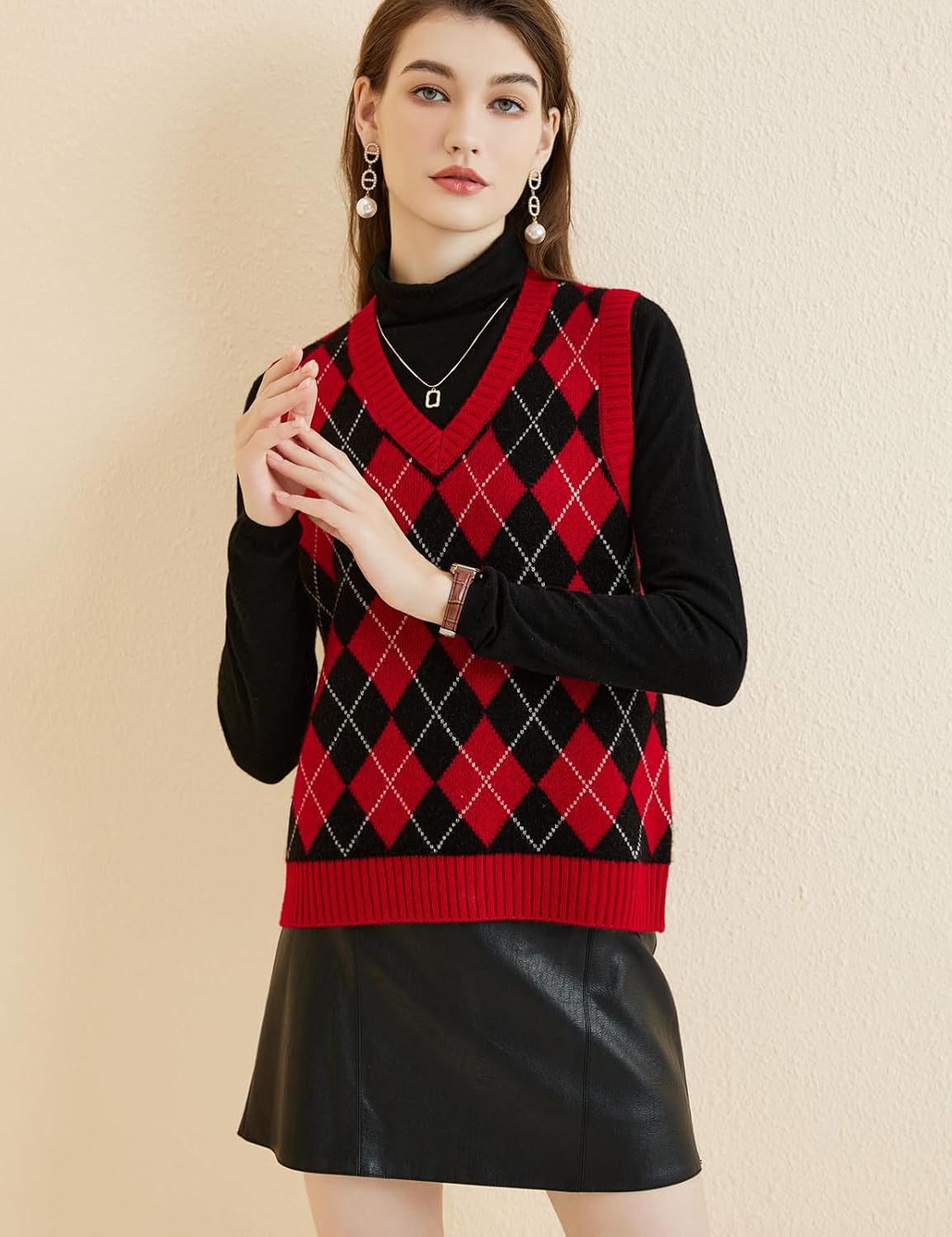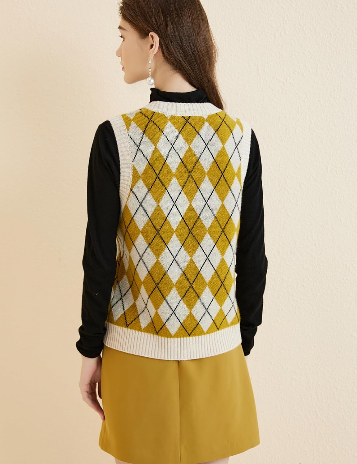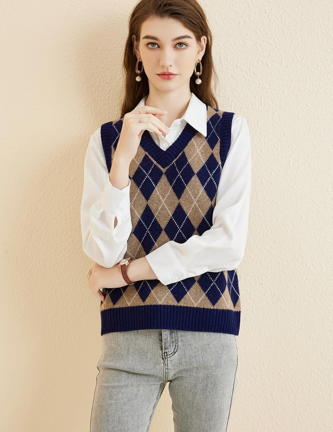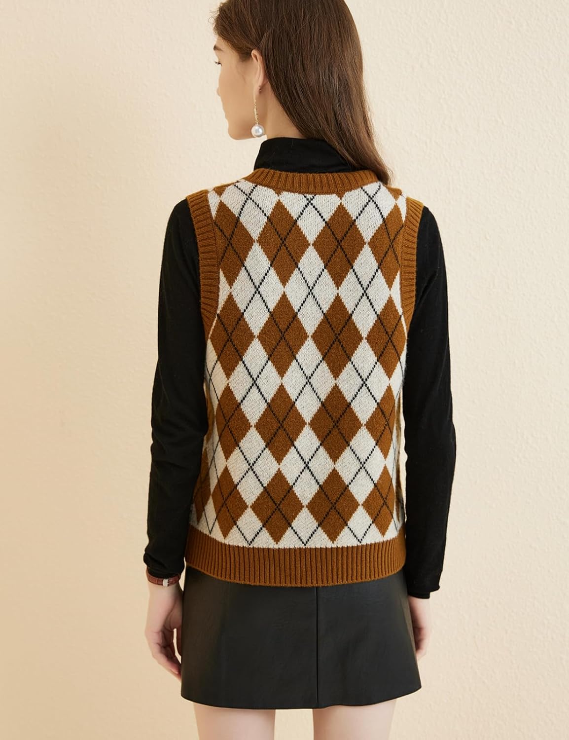 This is a nice, soft sweater vest. The pattern looks nice. Not sure what makes this a women’s sweater vest. The style and patttern are more like many traditionally men’s sweater vests.