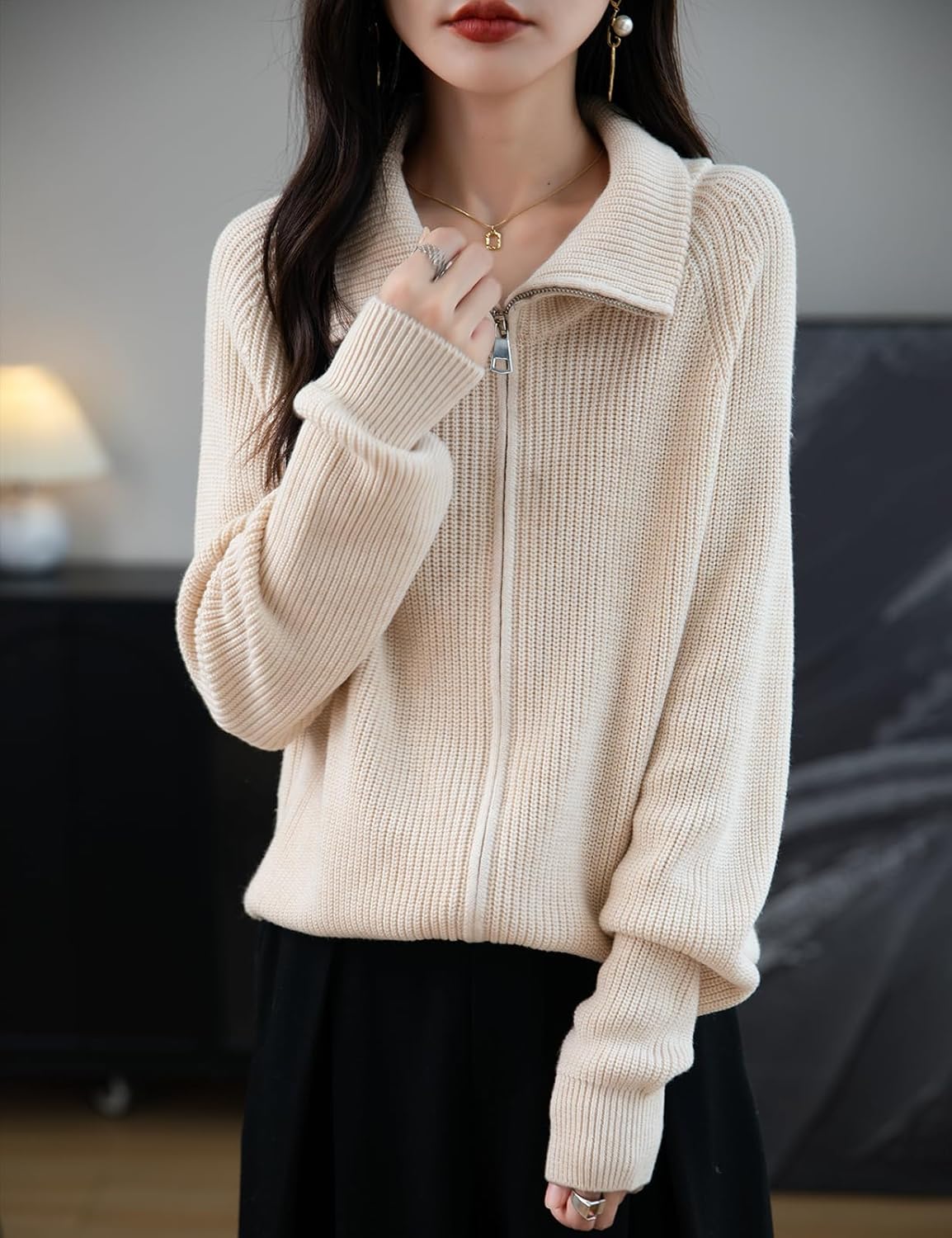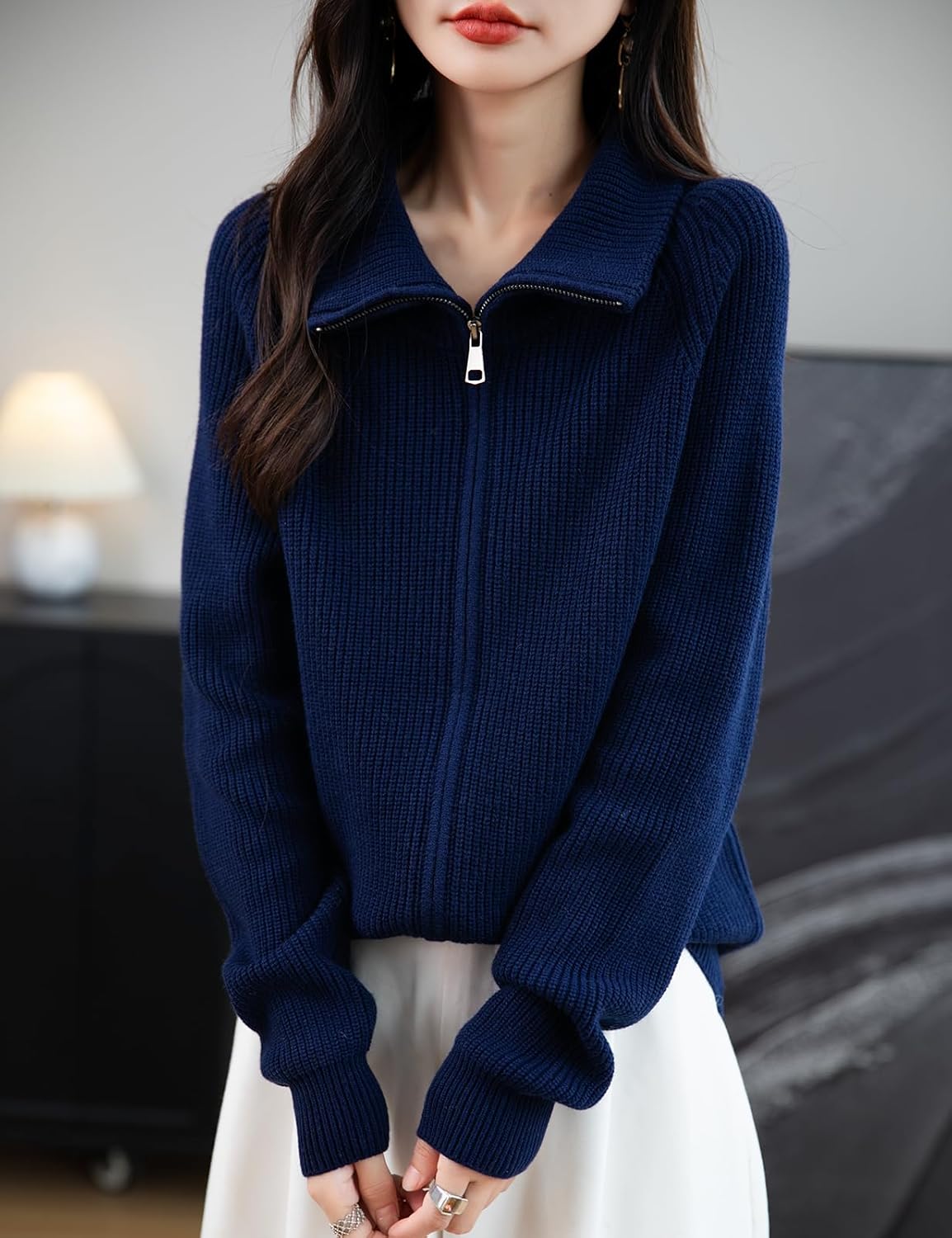 Merino Wool Blend Dragkedja Stickad Sweatshirt Cardigan