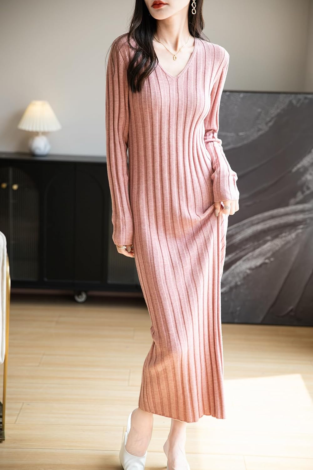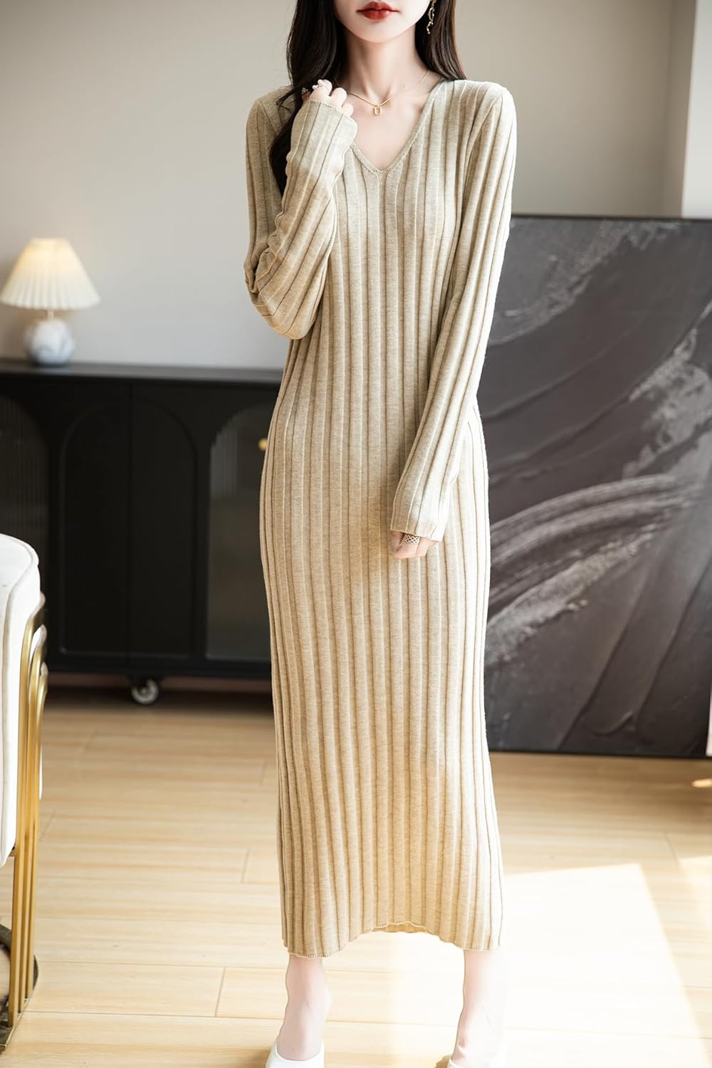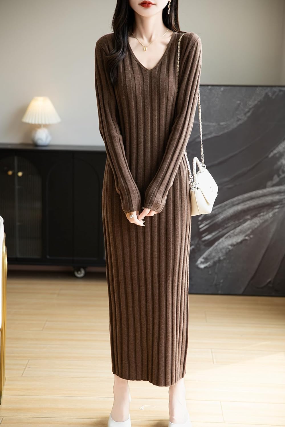 Merinoullblandning med V-ringad Ribbad Bodycon Stickad Klänning