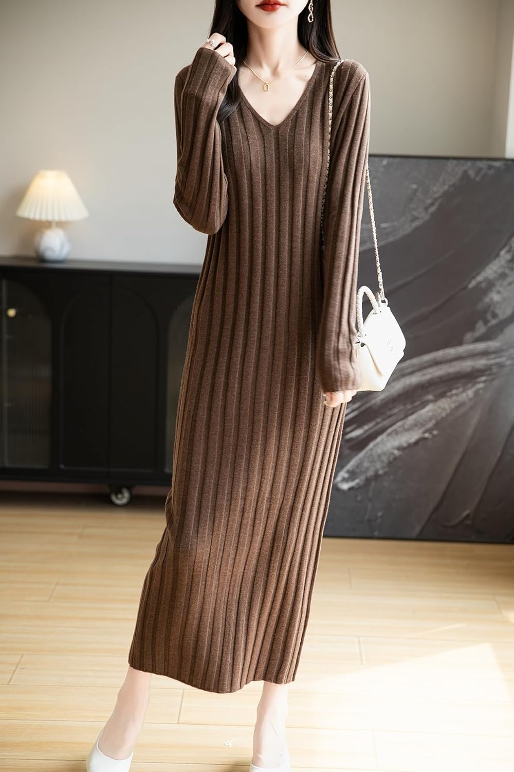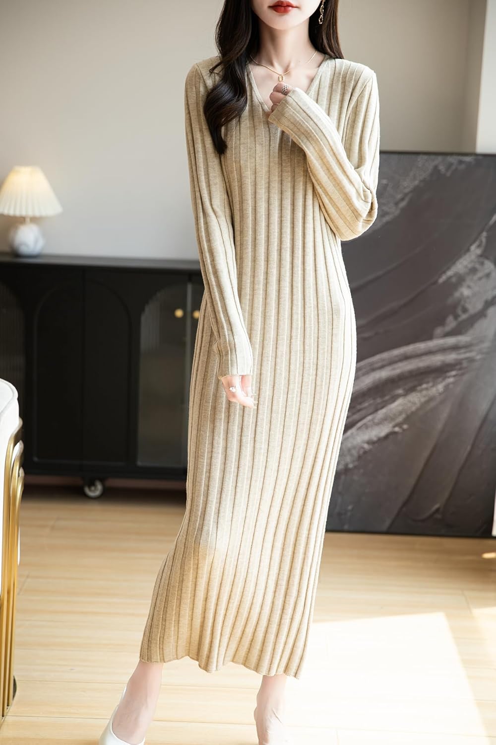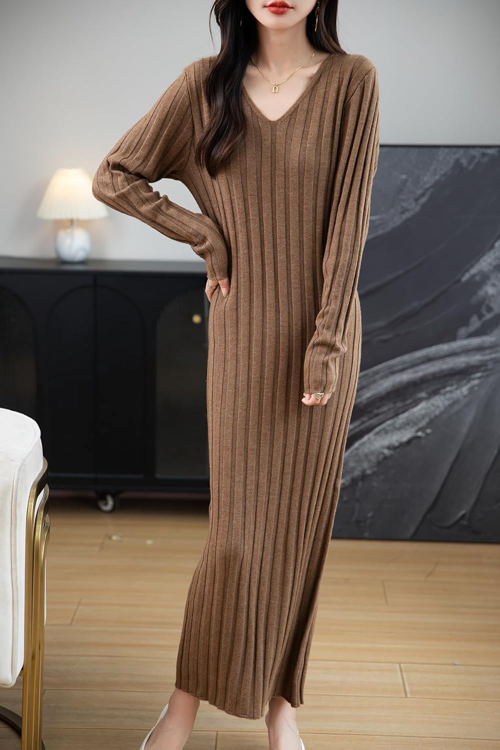 Merinoullblandning med V-ringad Ribbad Bodycon Stickad Klänning